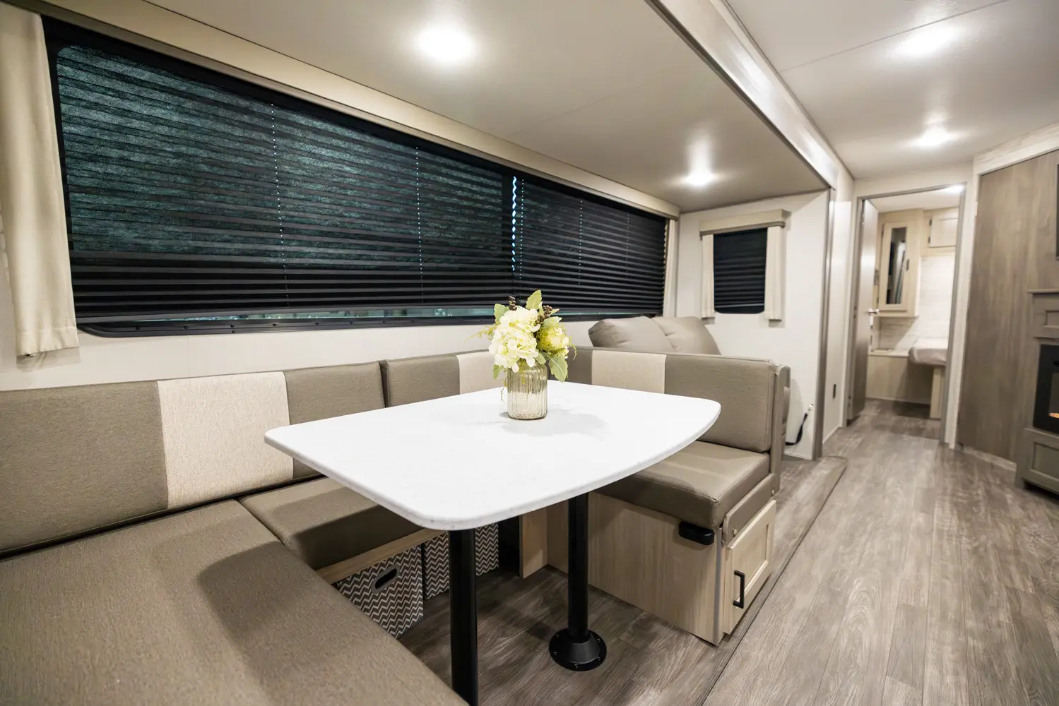 Spacious 36-foot bunkhouse trailer designed for family adventures. Three queen beds provide room for everyone. Durable construction, large fresh and gray water tanks, and a 21-foot awning make it perfect for road trips or back-country getaways.