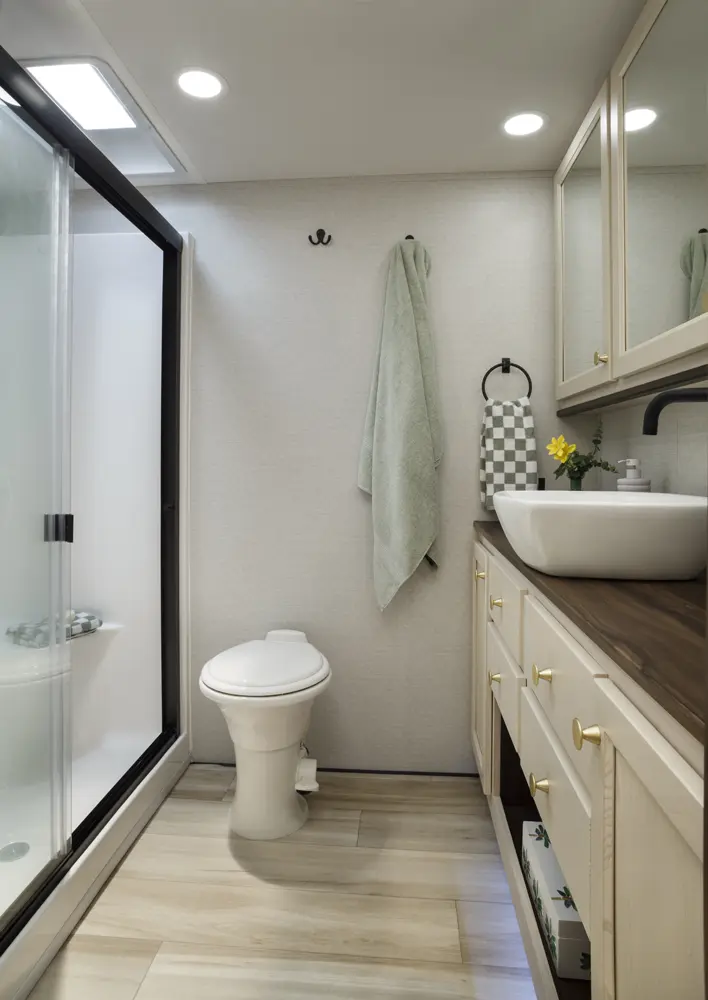 • Full 48” x 30” Rectangular Shower with Seat and Sliding Glass Doors