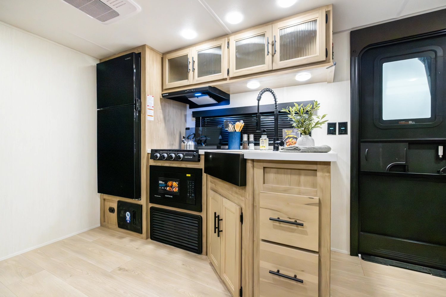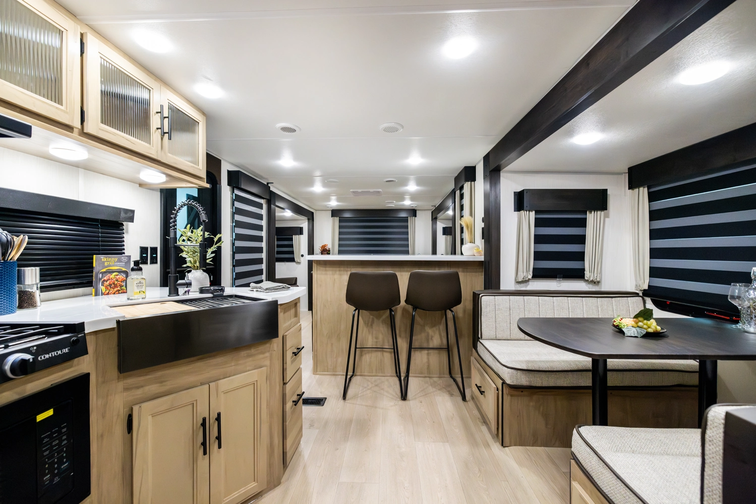 The triple slide is the perfect unit for affordable luxury and livability. The rear entertainment living room is surrounded by panoramic windows as well as two sofa slide and two recliners. The chef’s kitchen, kitchen bar with stools, and dinette slide with slide out drawers and full door pantry offer meet the needs of any chef. The private master suite completes the interior. Outside enjoy the Cherokee camp kitchen, outside entertainment speakers, and TV bracket under our power awning.