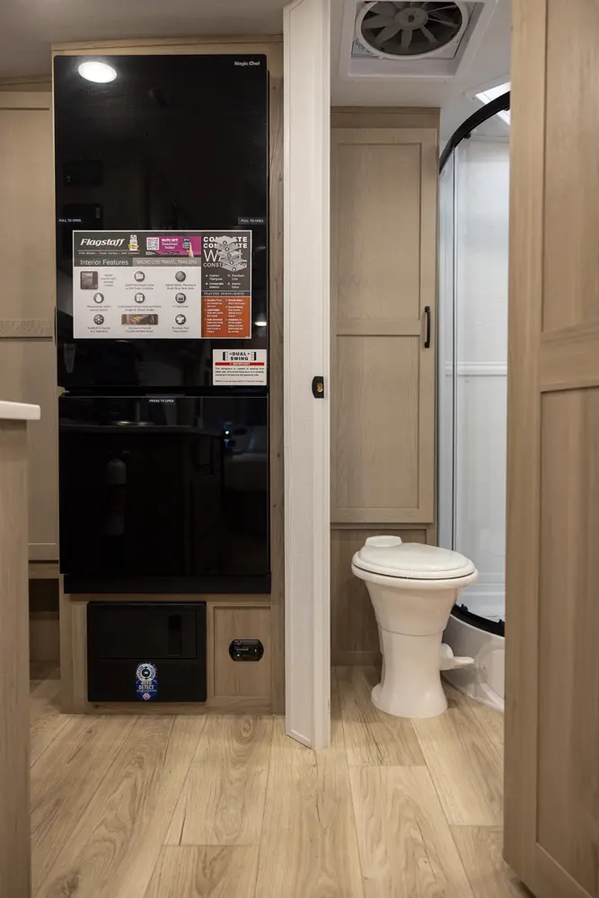 The Flagstaff Micro Lite 22FBS floorplan has one entry and one slide out. Exterior features include: fiberglass exterior and 18' awning. Interiors features include: front bedroom.