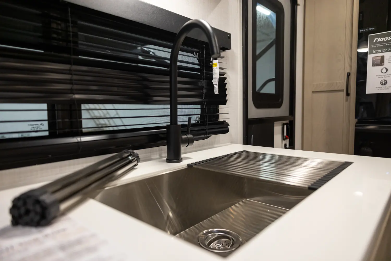 This revised floorplan features wide open living space and a drop frame for large front pass through storage. The baggage door on the front pass through is 30” by 24” which will accommodate all your camping accessories. The floor space in this unit caters to pet-friendly campers with room for kennels and large animal sleeping areas. If you and your pet want to cuddle up next to a nice warm fireplace with some family members on the theater seating, this is the unit for you.