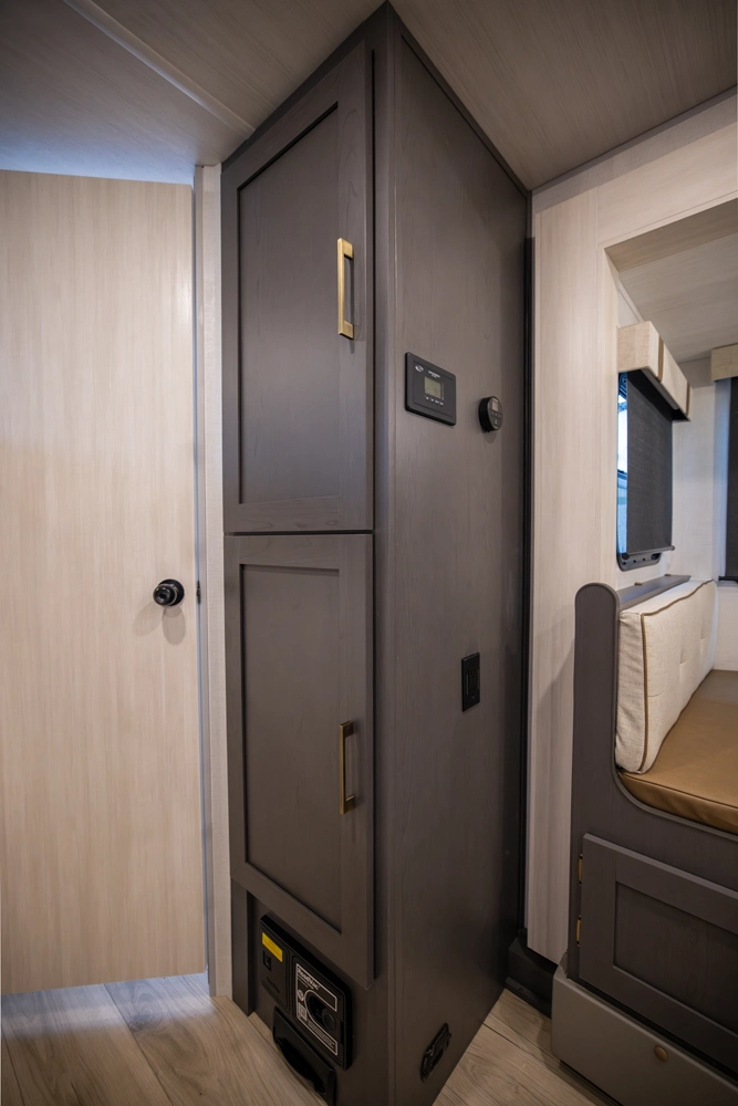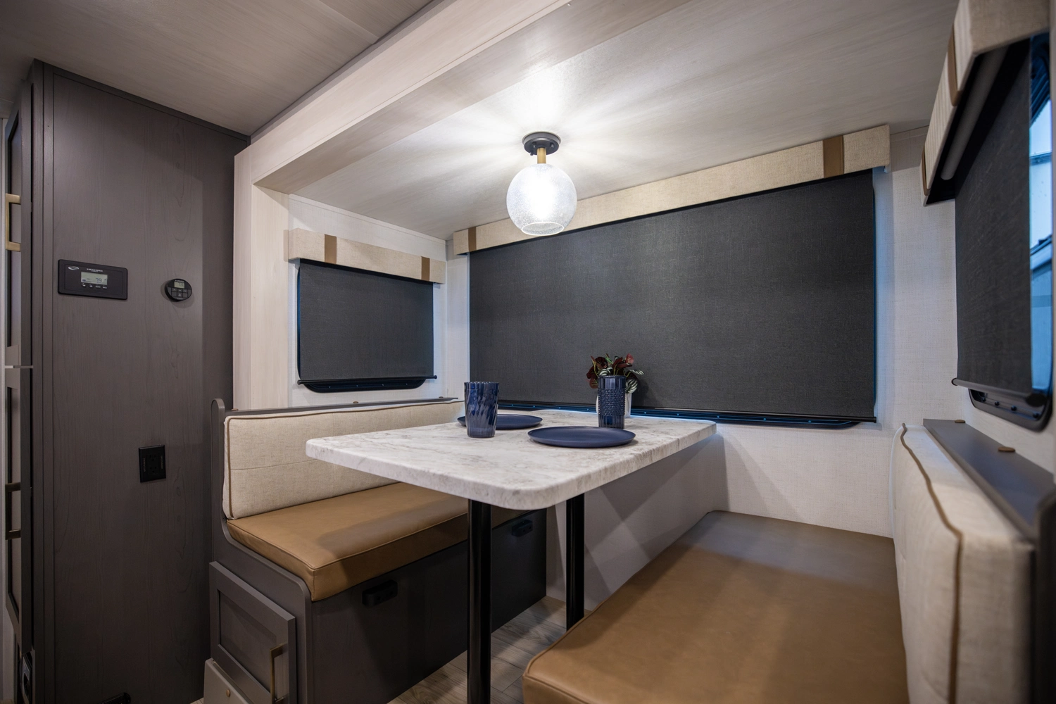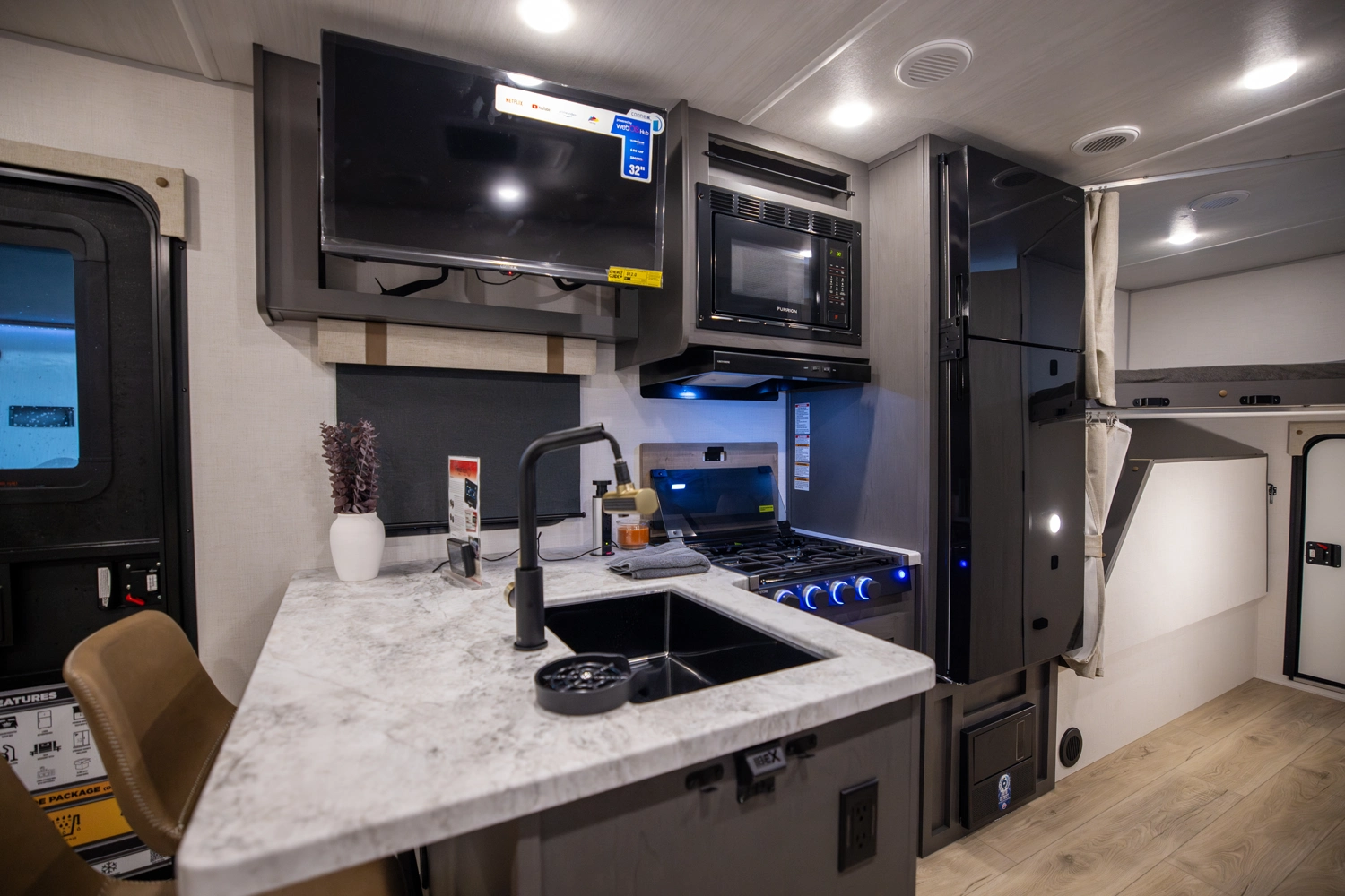 The 23MBH is a spacious, family-friendly travel trailer that combines comfort and versatility. A front Murphy bed converts to a sofa for added living space, while rear double bunks provide room for guests or kids. The slide-out dinette expands the interior, and the full kitchen—with microwave, air fryer, and pantry—makes meals easy. A full bath adds comfort, and exteriors features like an enclosed underbelly and 16' awnings keep you ready for adventure.