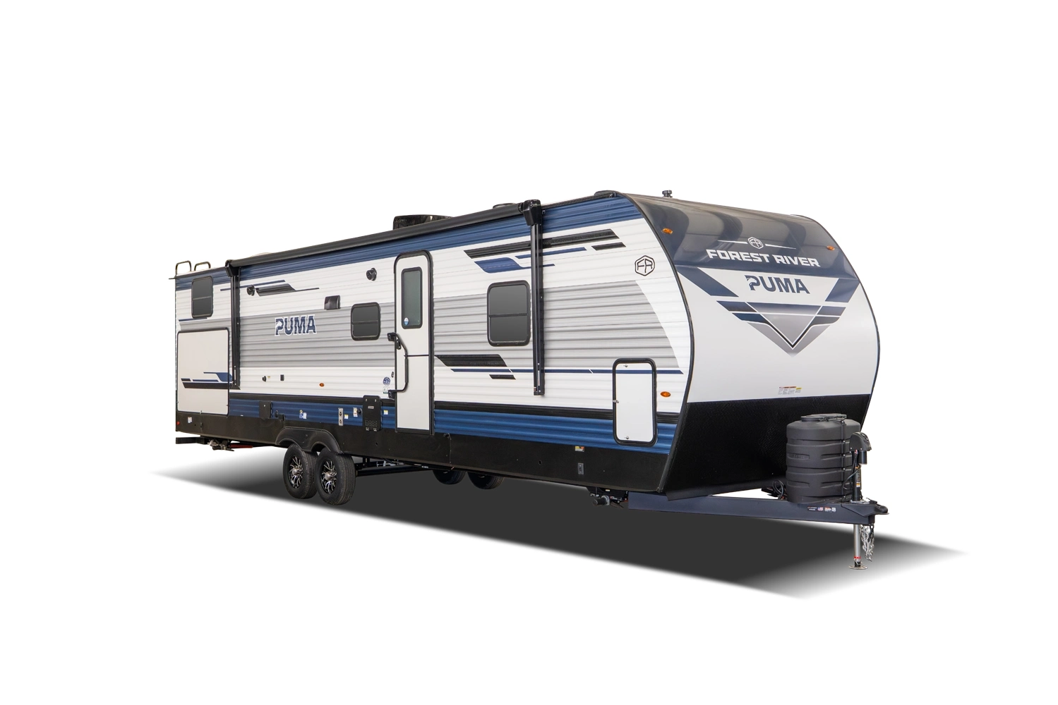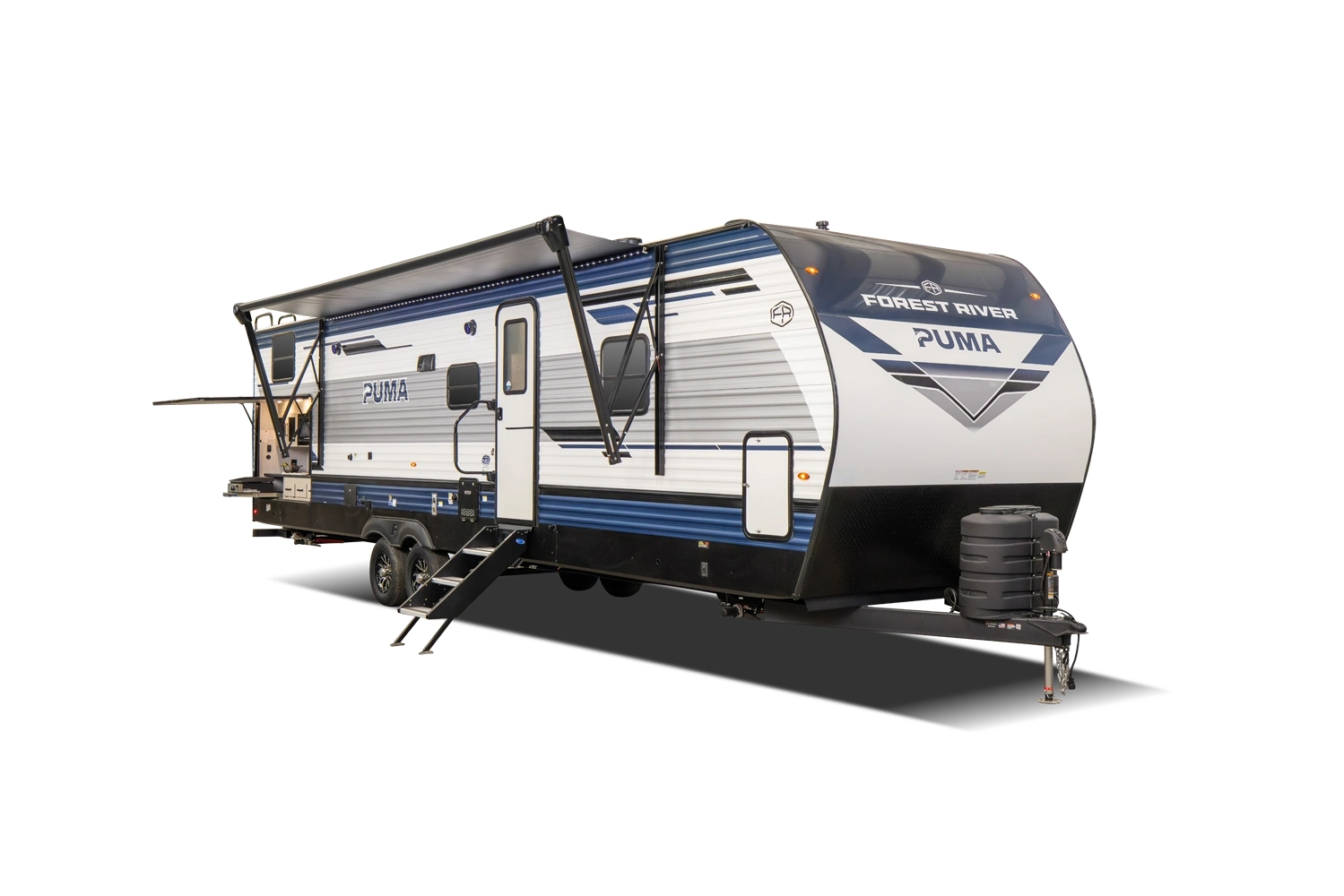 This rear bunk travel trailer provides great space for you and all of your family. With three slides, all on one side of the unit, it will grant you and the guests room everywhere you go. The L shaped countertop in the kitchen gives you the ability to entertain without feeling cramped. The front bedroom has a slide out containing a bed, along with a deep closet. Furthermore, you are provided with a great deal of natural light through out with windows in every room.