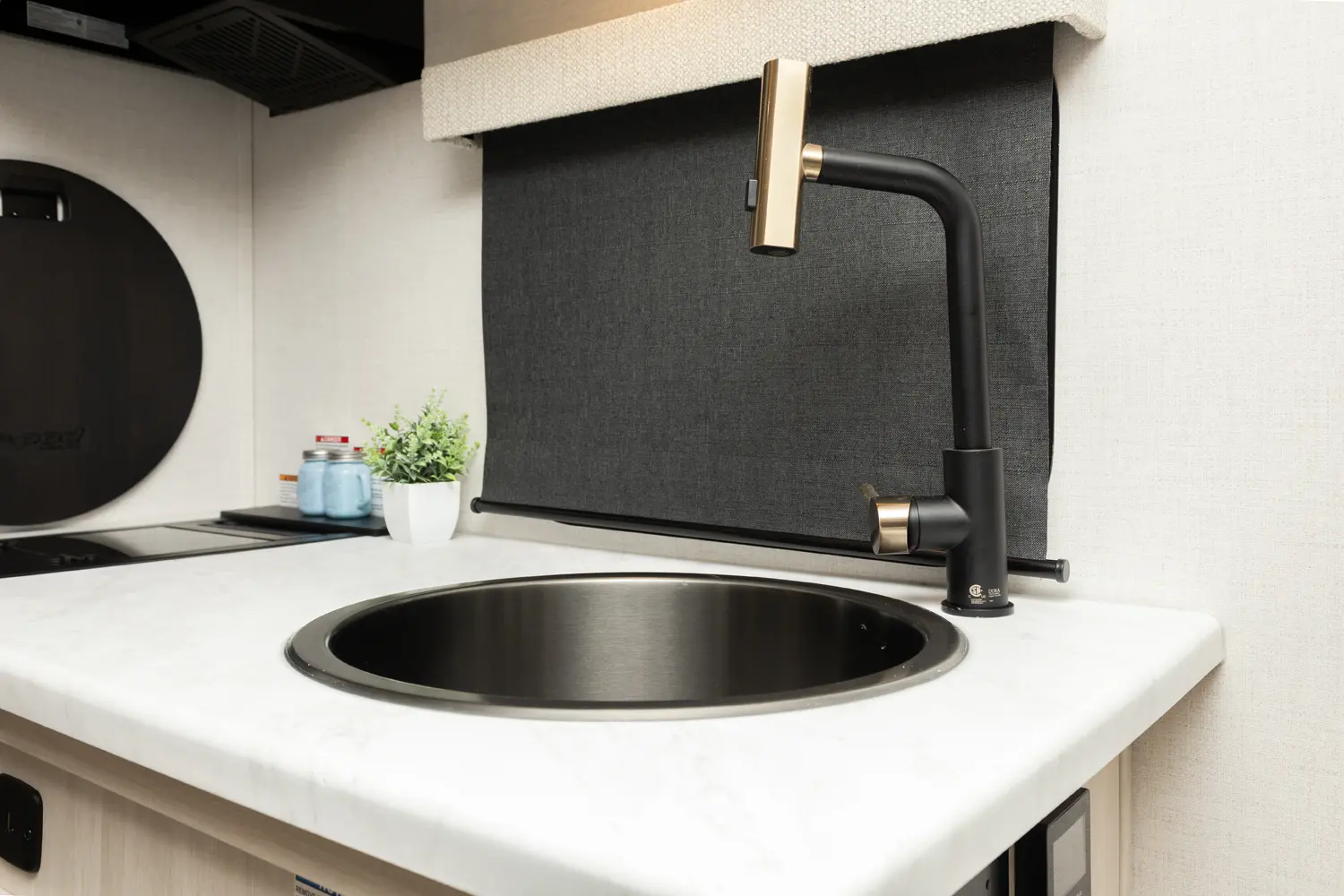 The RP-192 offers a spacious layout in a compact design. It features a versatile front Murphy bed that converts to a sofa, maximizing living space. The rear bath includes a full shower and ample wardrobe storage. A booth dinette provides dining and additional sleeping options. Modern amenities like a convection microwave, 12V refrigerator, and central vacuum system ensure comfort on the road. Ideal for couples or small families seeking a lightweight, feature-rich travel trailer.
