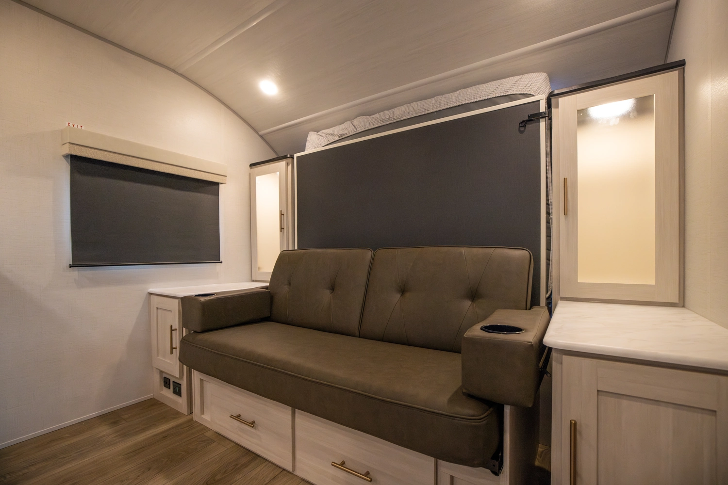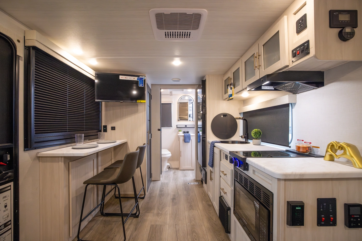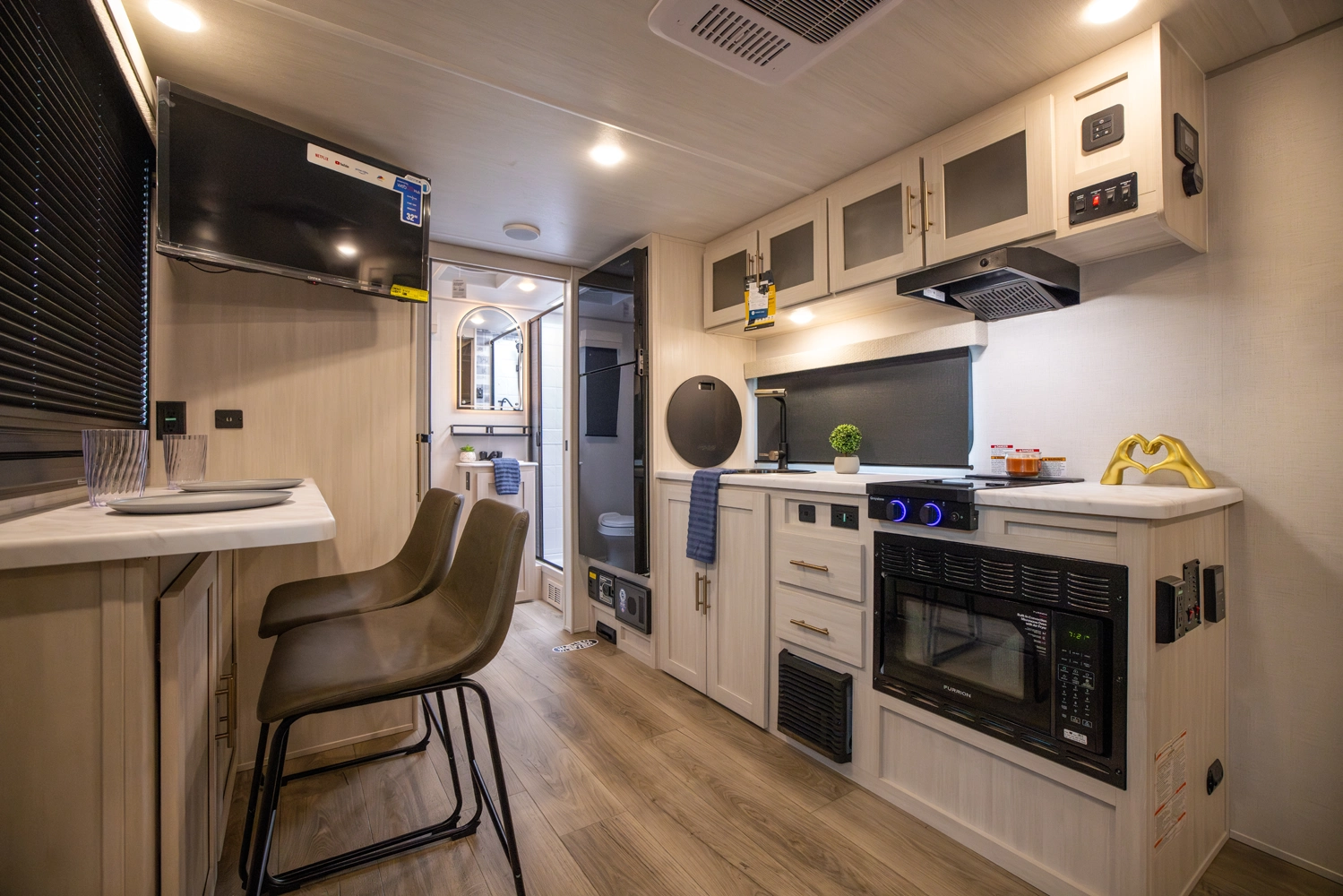 The RP-197 combines lightweight towing with a versatile layout. A front Murphy bed converts to a sofa for extra living space, while the rear full bath adds convenience. The kitchen and living area feature a bar top with a flip-up window, ideal for serving or relaxing outdoors. Modern finishes and smart storage make this trailer perfect for couples or small families seeking comfort on the road.
