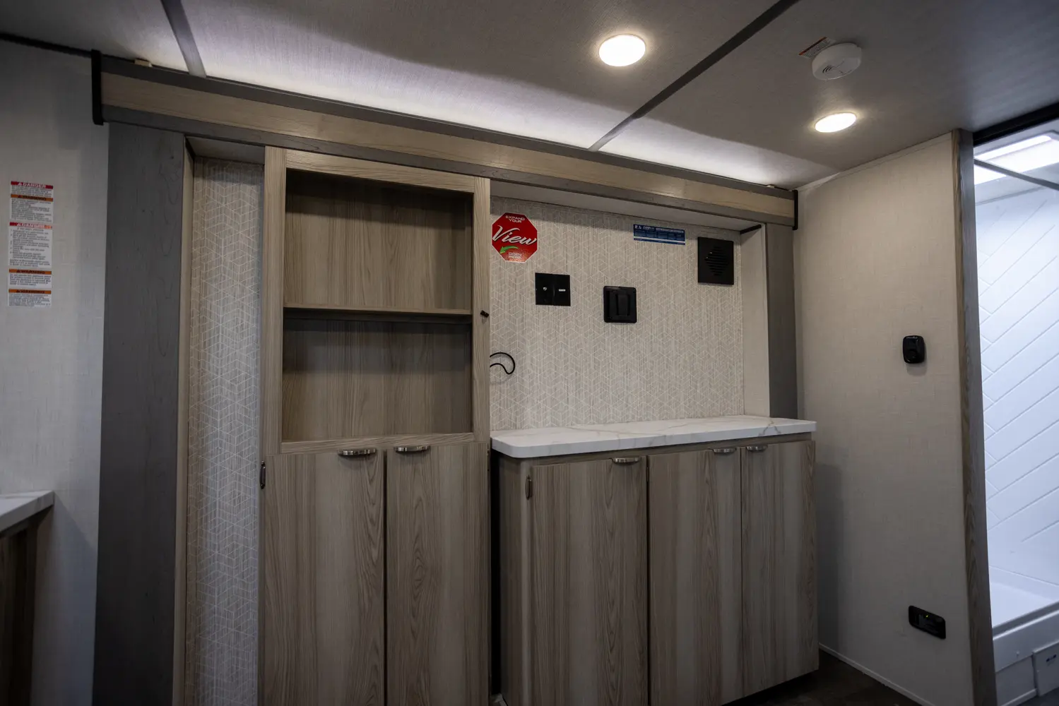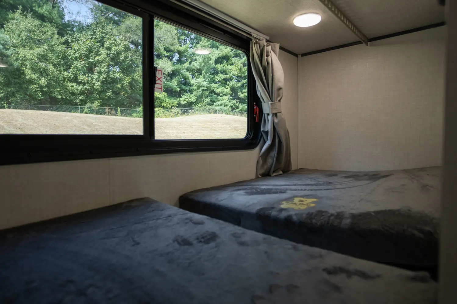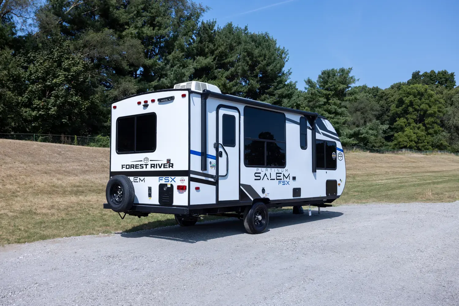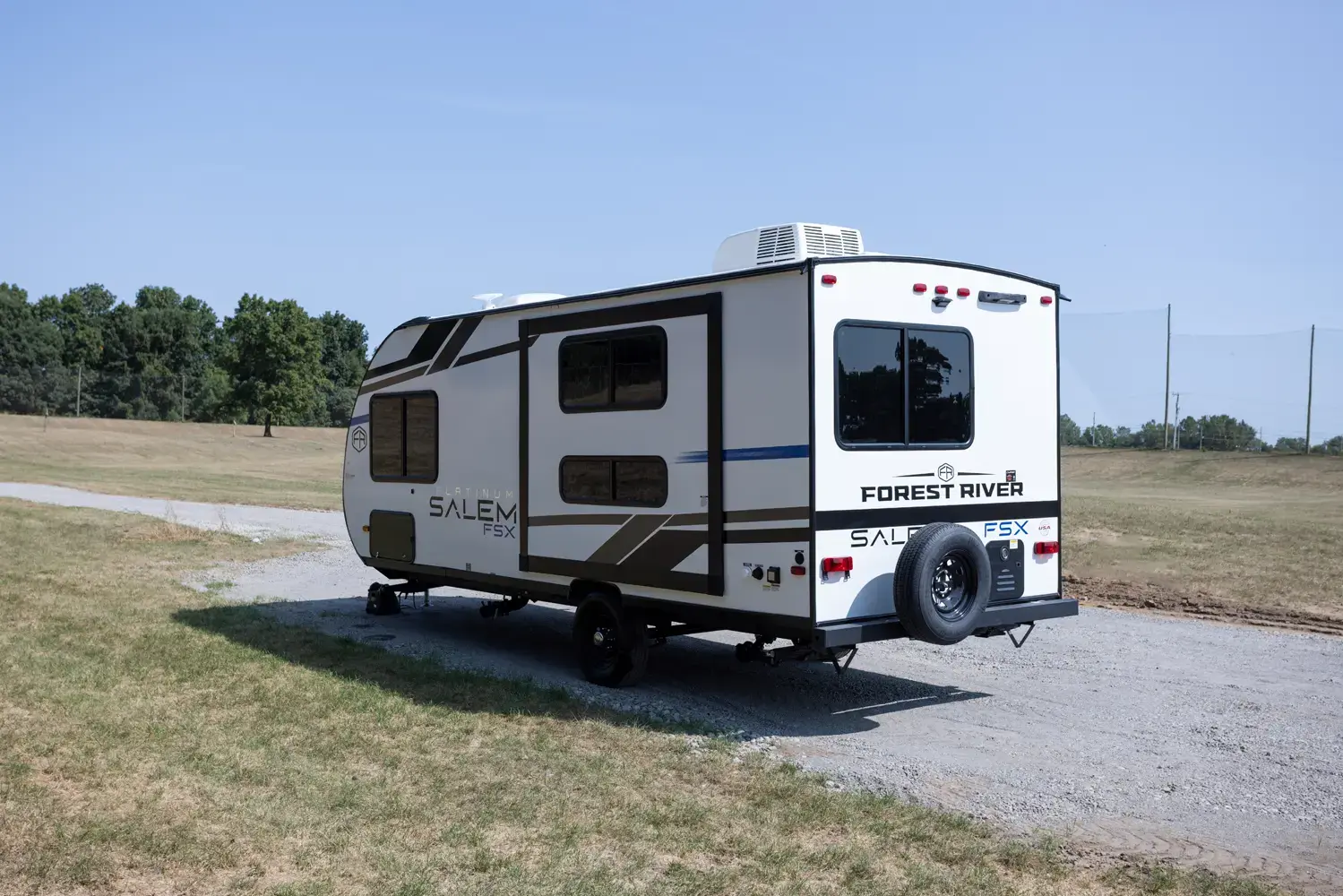 The Salem FSX 165RKS floorplan has one entry and one slide out. Exterior features include: fiberglass exterior and 15' awning. Interiors features include: bunk beds, rear kitchen, front bedroom and pass through bathroom.