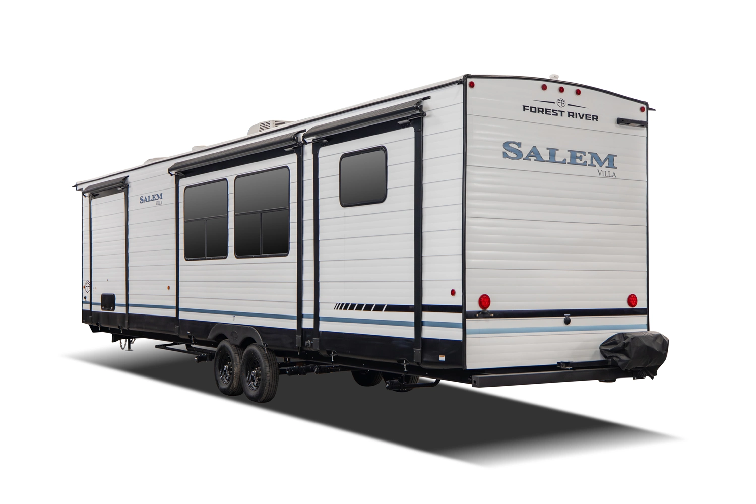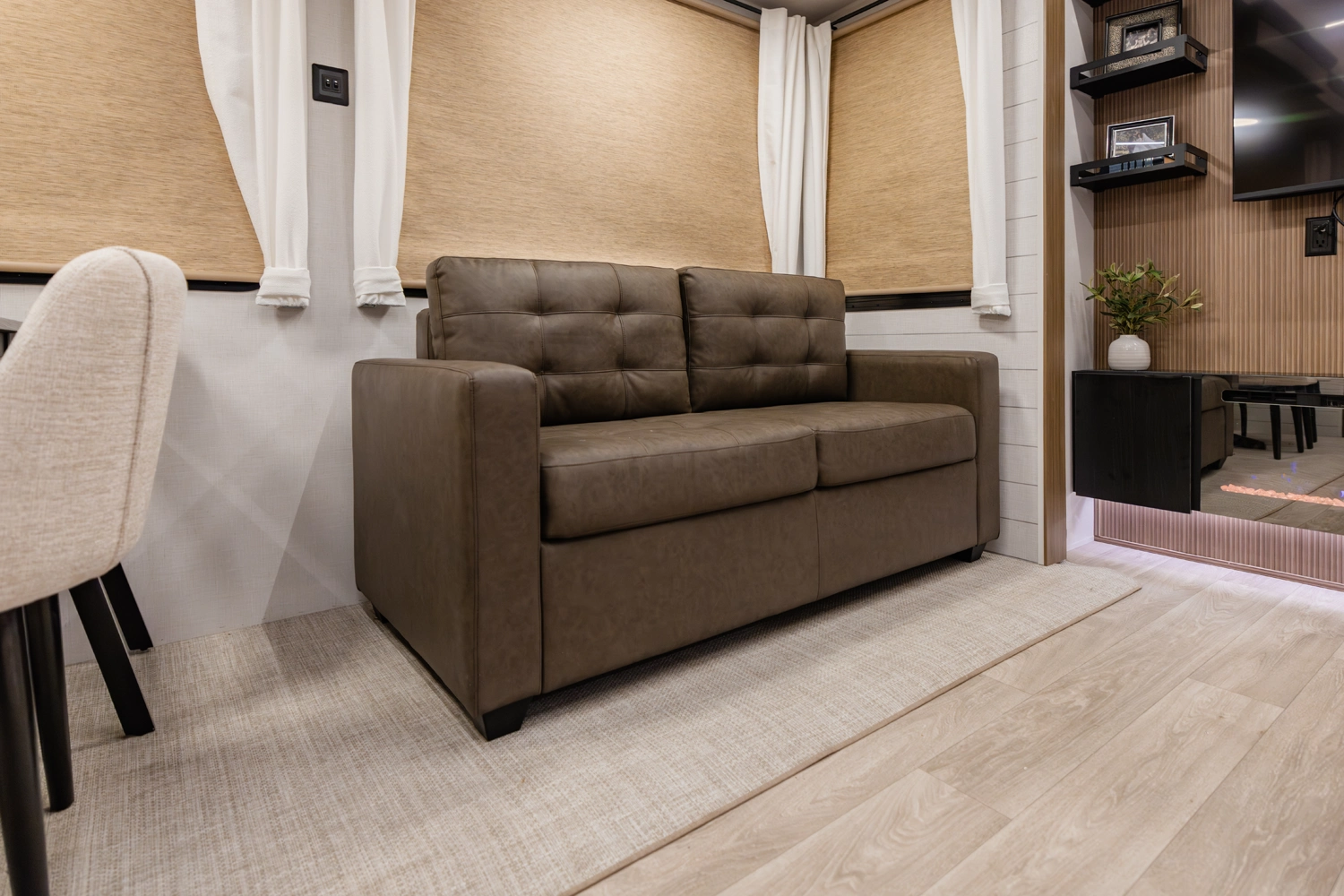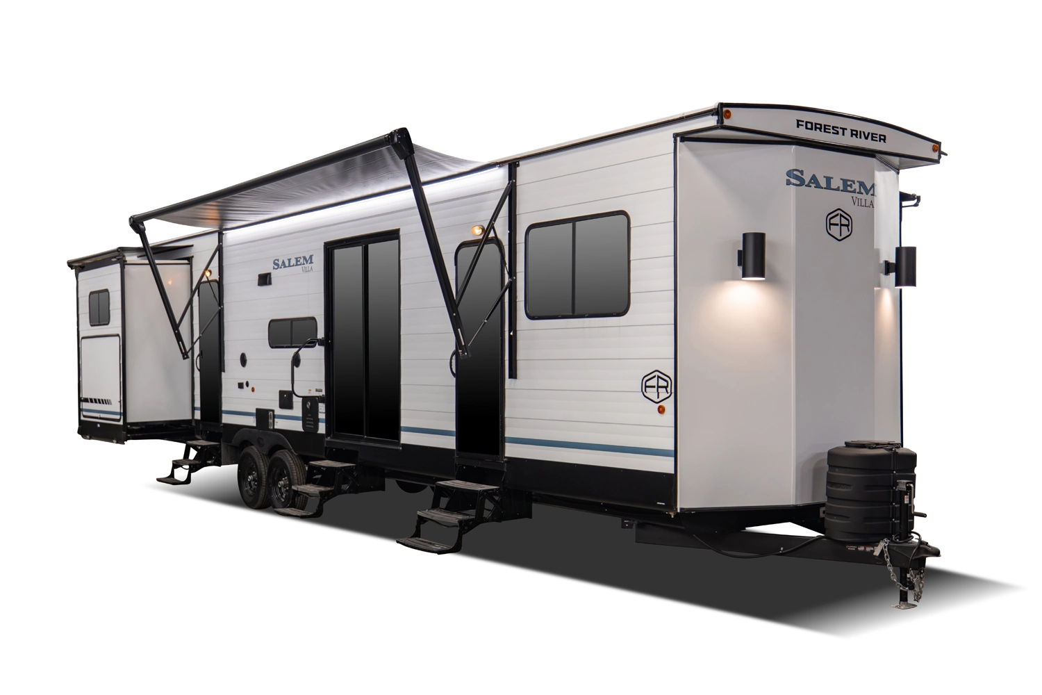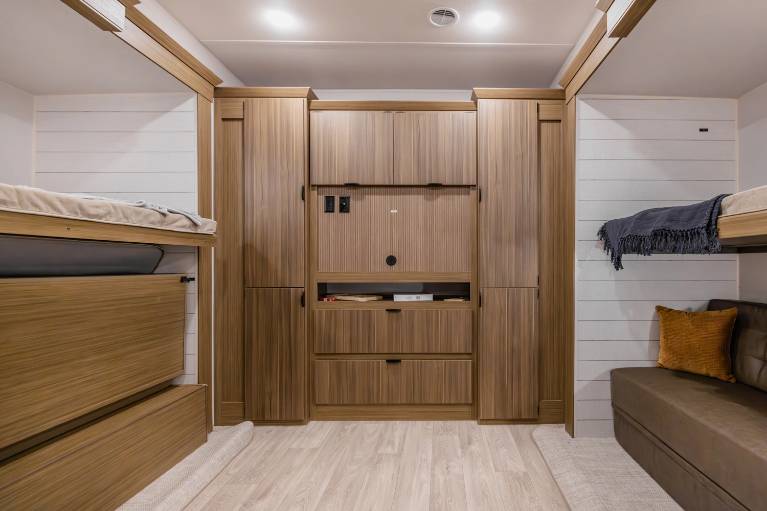 The 42QBQ is the ultimate bunkhouse, with four slides and an outdoor kitchen. The large front queen bedroom includes plenty of closet and cabinet space, while the adjacent bathroom gives you a walk-in radius shower. The living area features panoramic windows, fireplace (heater), and a tri-fold sofa. The bunk room provides 3 bunks plus the Versa-Queen giving the option of having another bunk, sofa, or queen bed. Do not forget the half bath with convenient door to the outside.