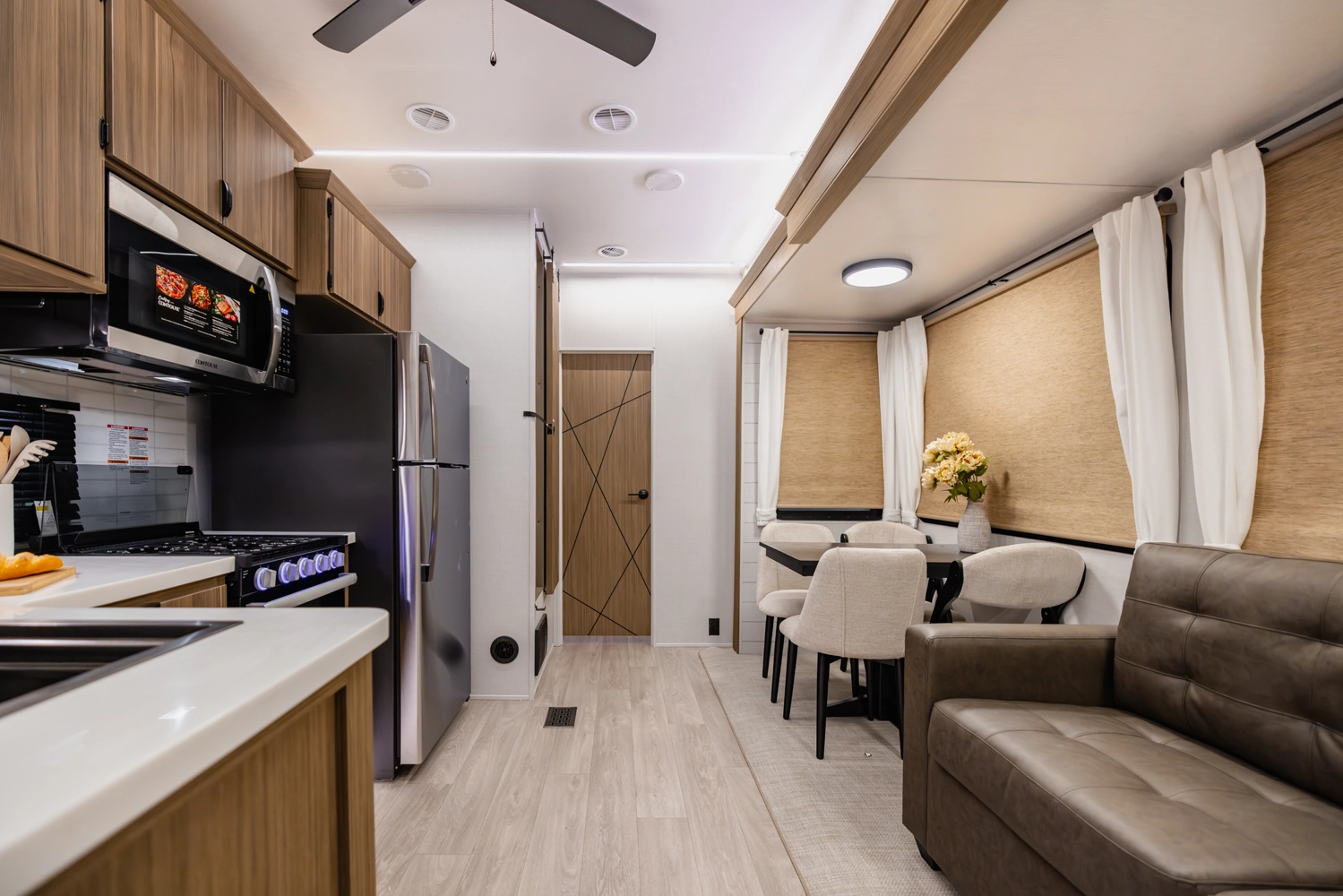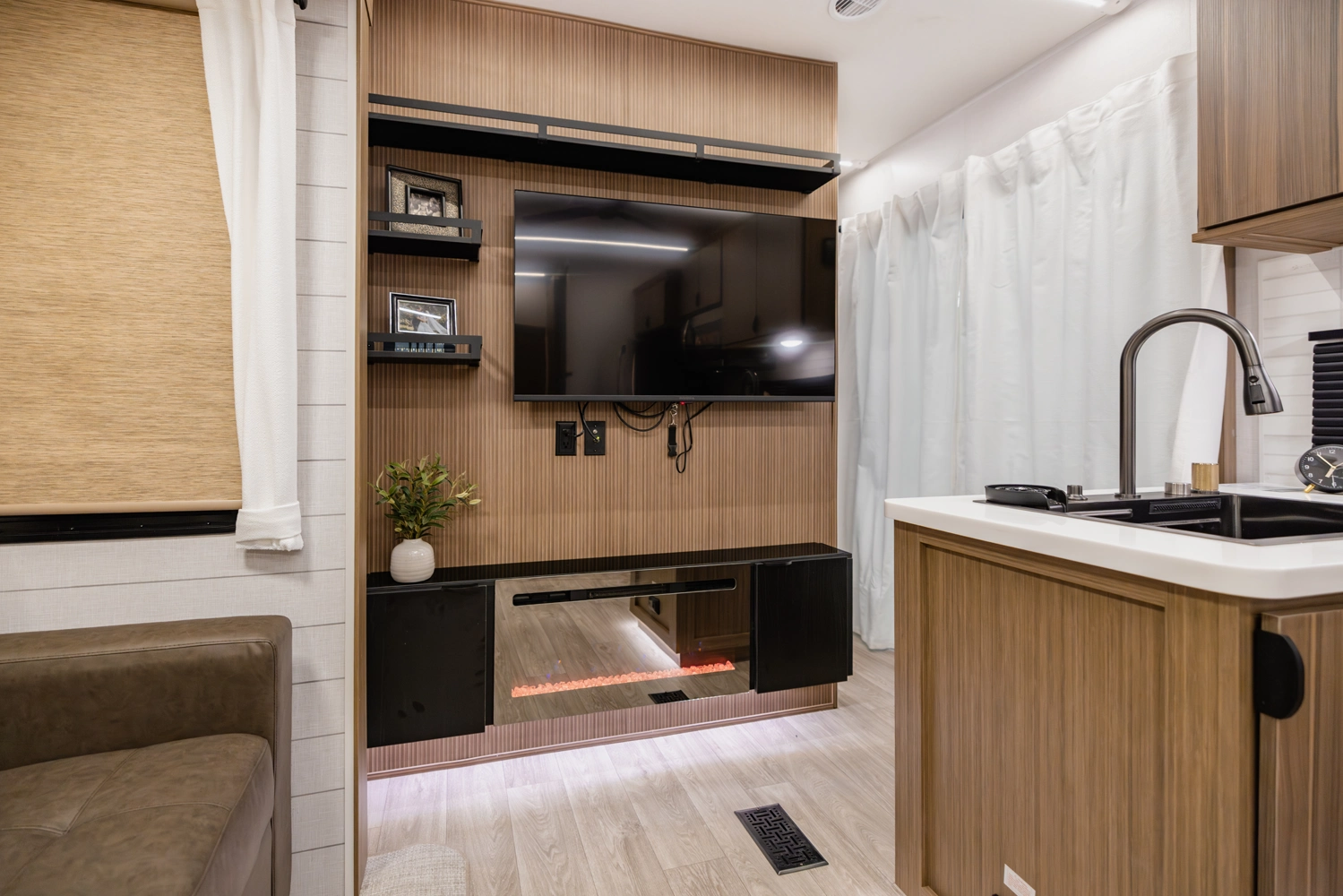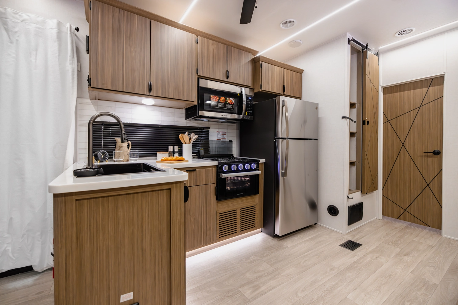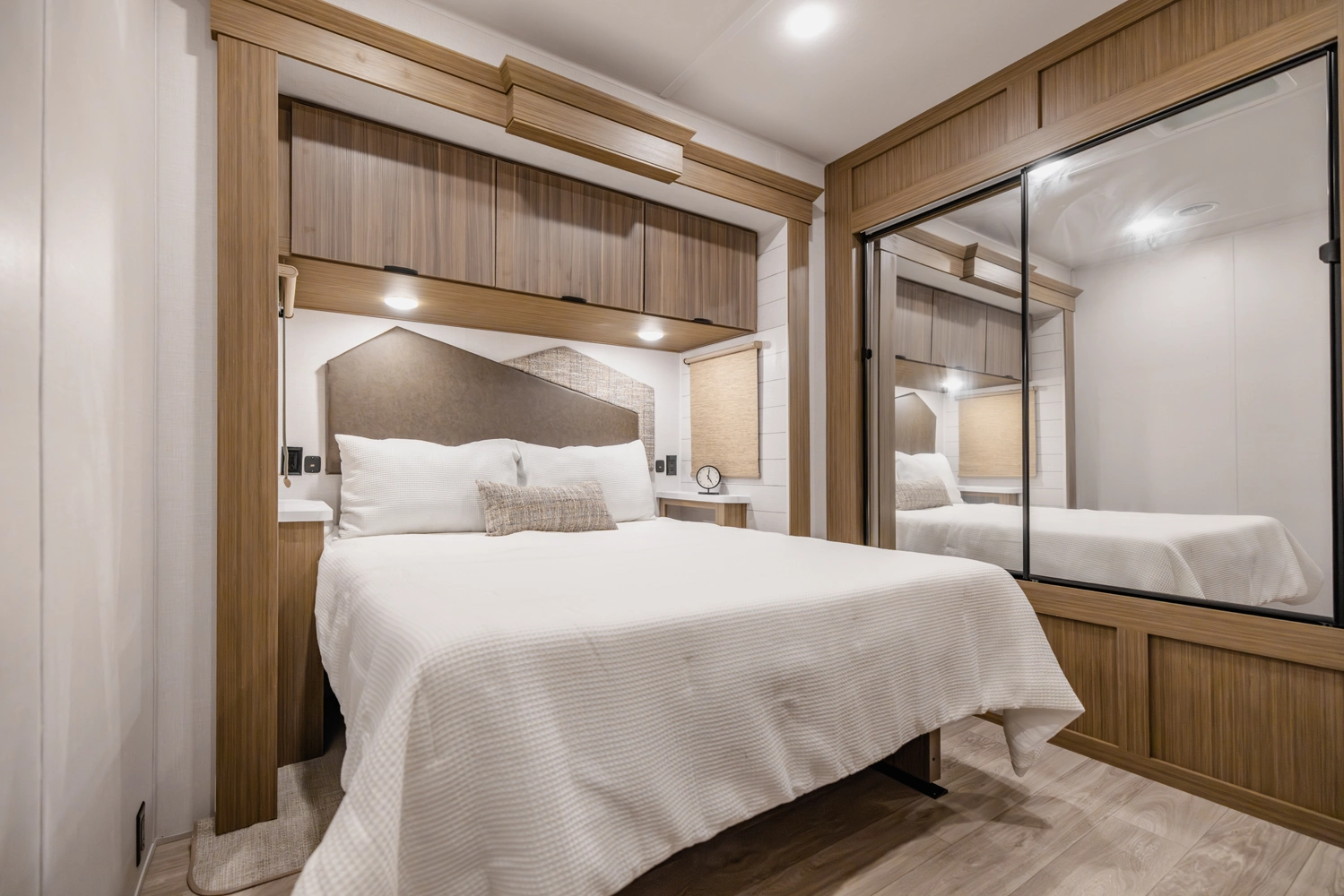 The 42QBQ is the ultimate bunkhouse, with four slides and an outdoor kitchen. The large front queen bedroom includes plenty of closet and cabinet space, while the adjacent bathroom gives you a walk-in radius shower. The living area features panoramic windows, fireplace (heater), and a tri-fold sofa. The bunk room provides 3 bunks plus the Versa-Queen giving the option of having another bunk, sofa, or queen bed. Do not forget the half bath with convenient door to the outside.