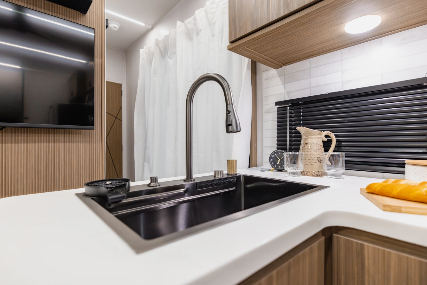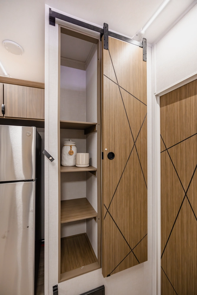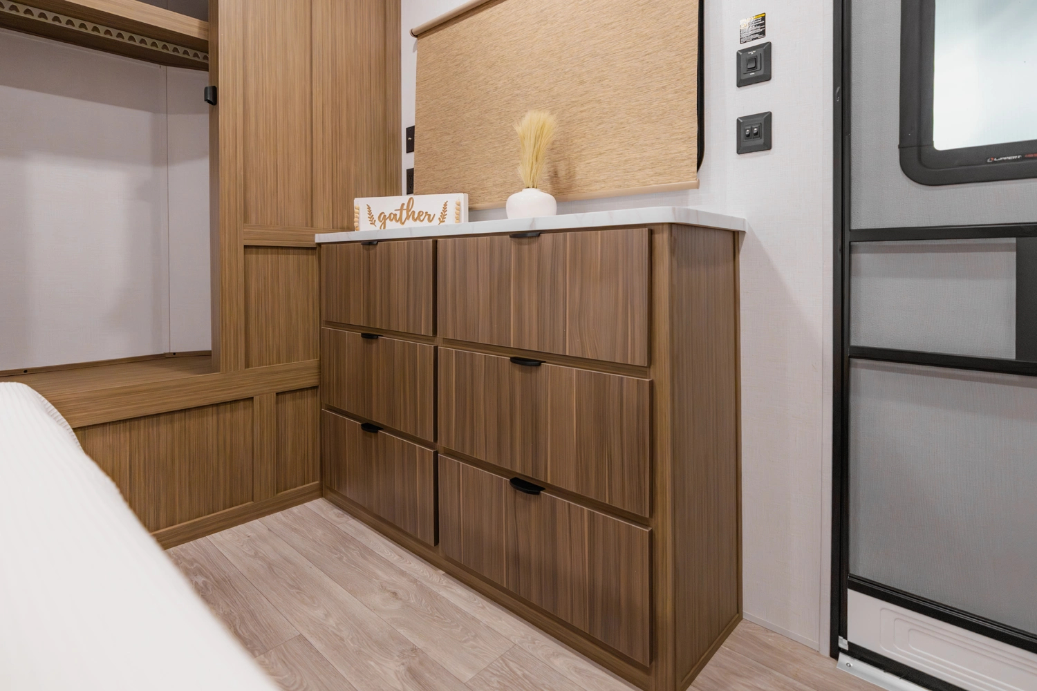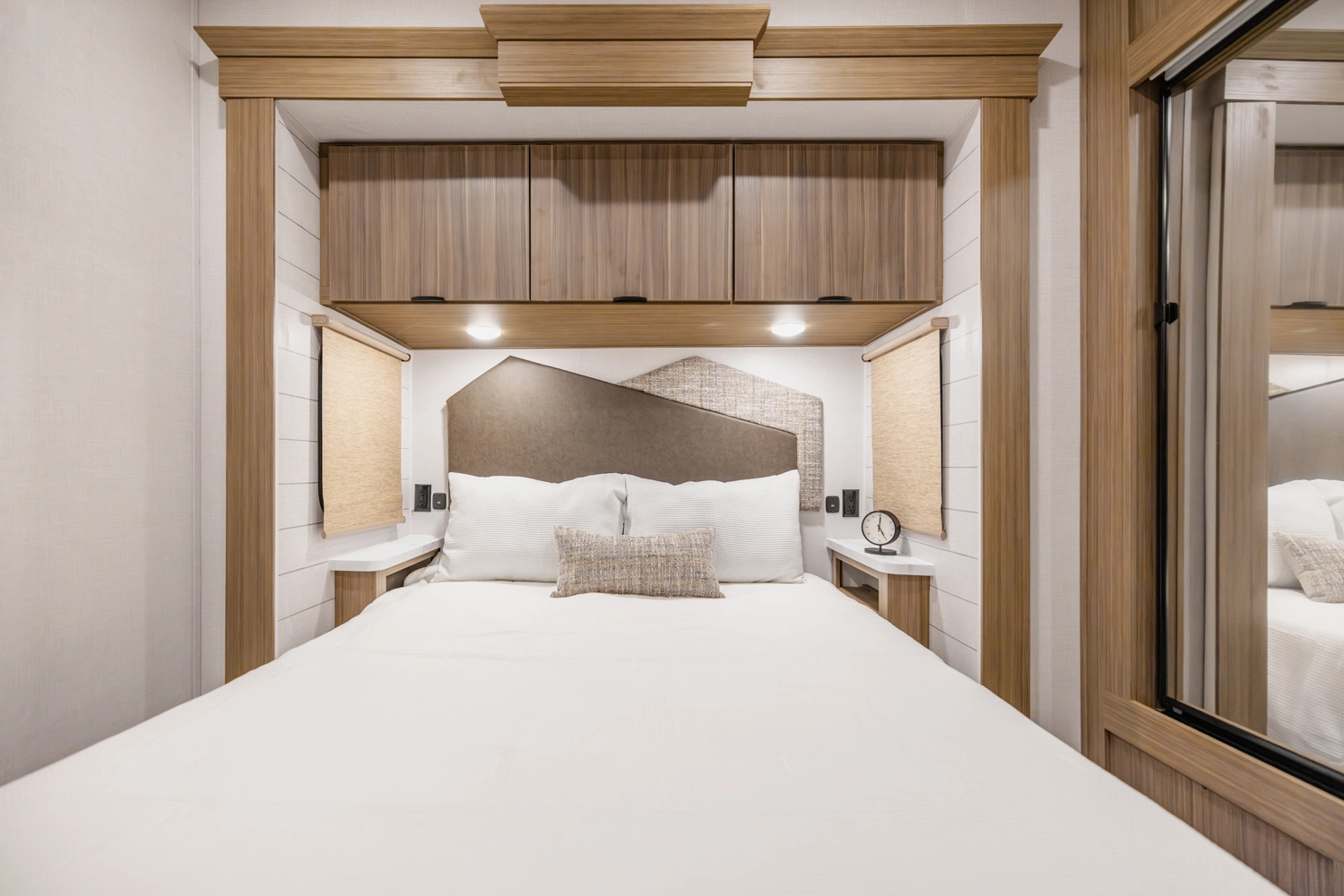 The 42QBQ is the ultimate bunkhouse, with four slides and an outdoor kitchen. The large front queen bedroom includes plenty of closet and cabinet space, while the adjacent bathroom gives you a walk-in radius shower. The living area features panoramic windows, fireplace (heater), and a tri-fold sofa. The bunk room provides 3 bunks plus the Versa-Queen giving the option of having another bunk, sofa, or queen bed. Do not forget the half bath with convenient door to the outside.