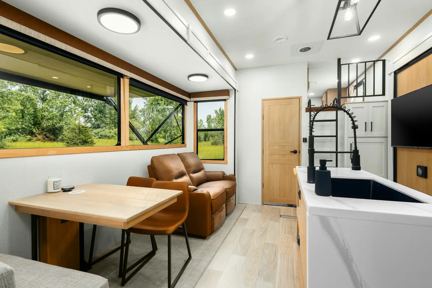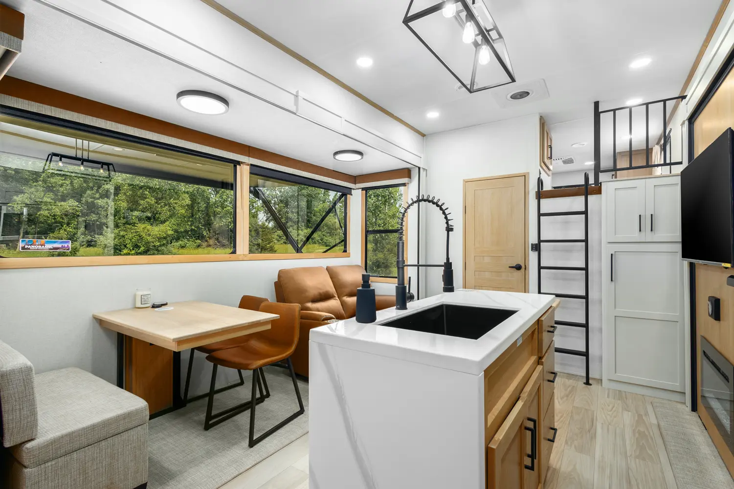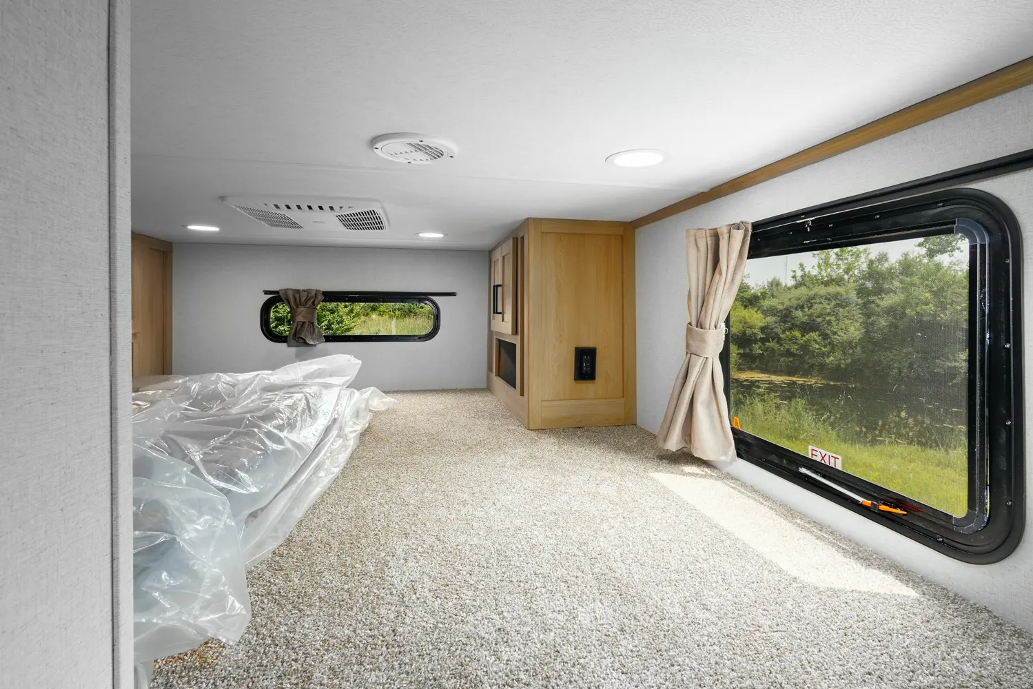 The 4002FB is a double queen bed and loft coach. With 4 slideouts and a double bunk loft, this floorplan has enough sleeping space for whoever wants to tag along. Rear entry into the 2nd full bath will offer full amenities without cluttering or using the master bath. The island kitchen and theater seating provide a great space to entertain and unwind. The 4002FB is extremely versatile, utilizing the extra bedroom or loft for storage when the sleeping space isn't needed.