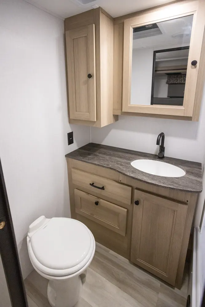 The 3250DSLE is a bunkhouse model. There's a 28" x 72" flip-down bunk above with a kids' sofa sleeper that folds out to a bed below. The adults can enjoy their own sleeping area in the rear. The bathroom offers a 24" x 32" shower with tub, along with linen storage. The kitchen is set up to maximize space, while a booth dinette and sofa provide additional seating and sleeping areas. In front, a 60" x 80" cab over bunk gives you even more space! Built on the Ford E450 Chassis.