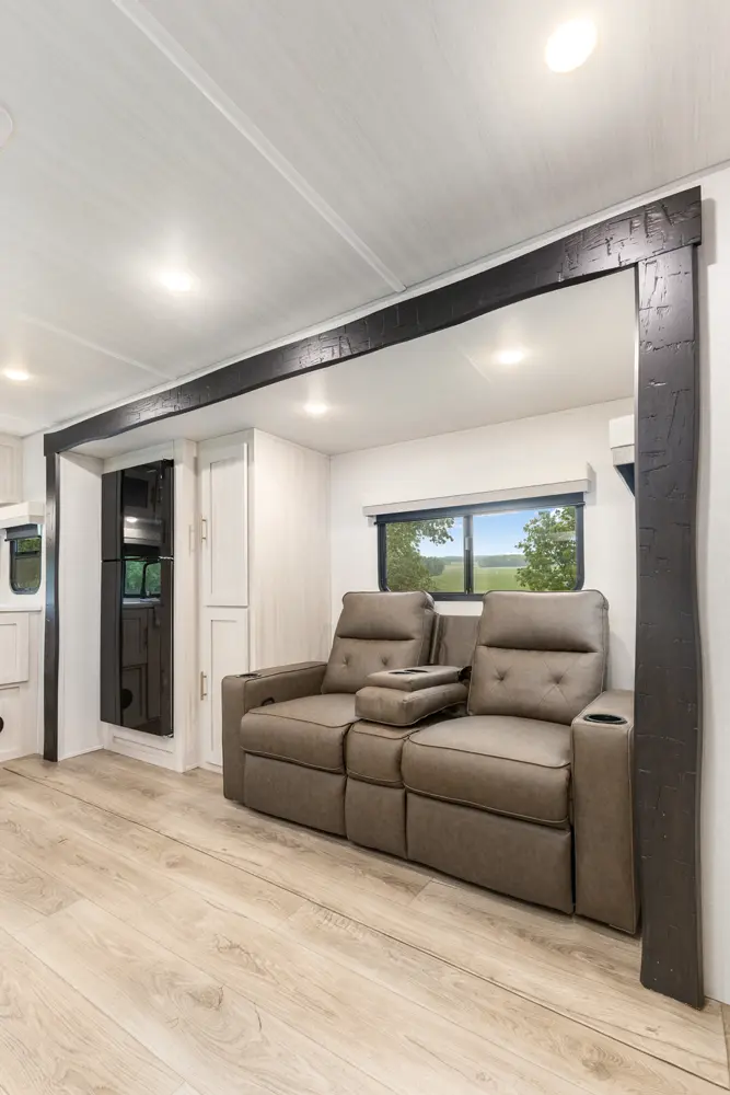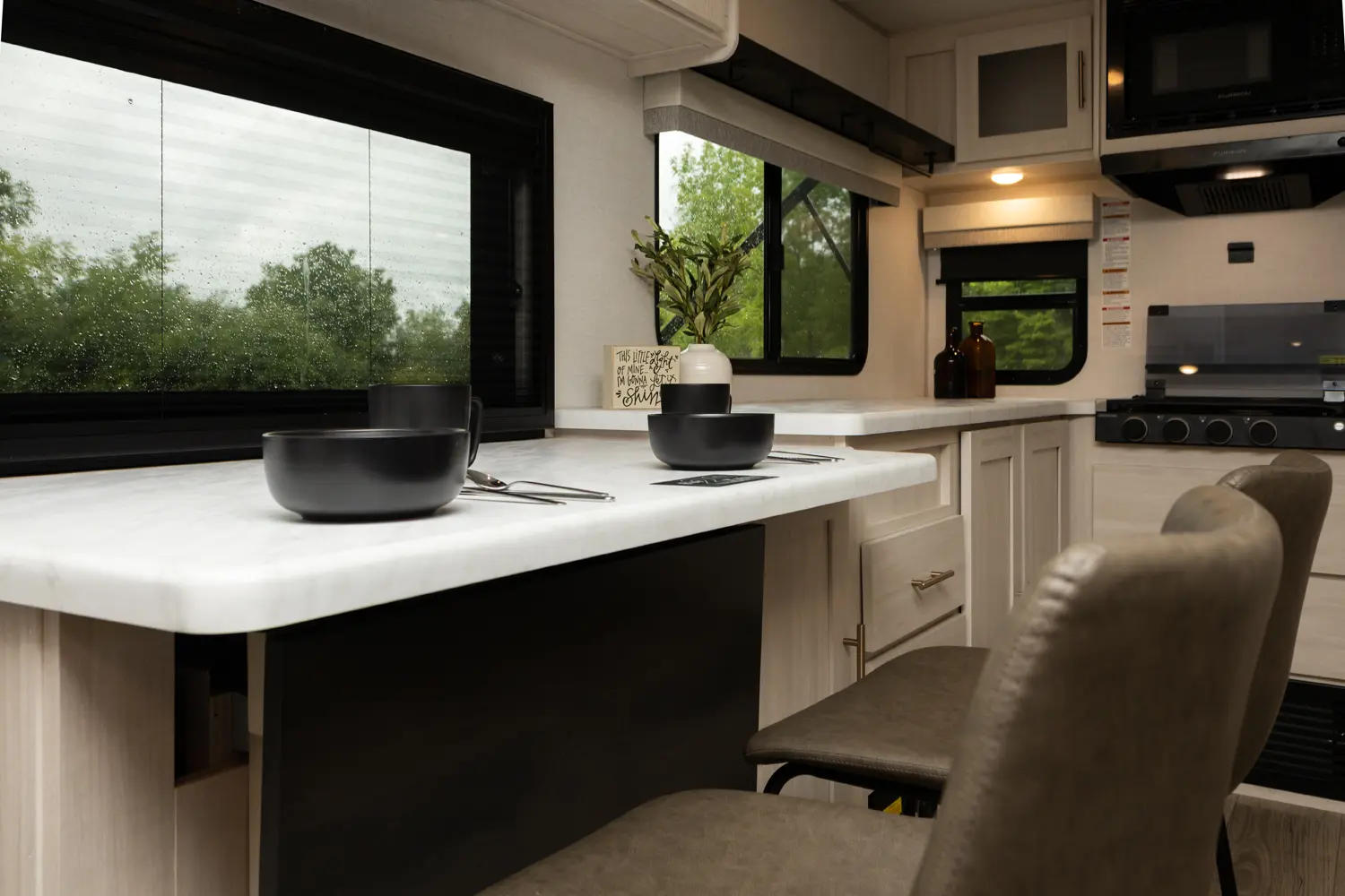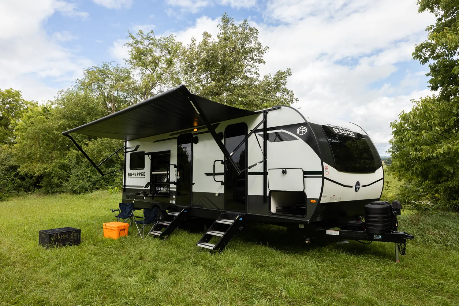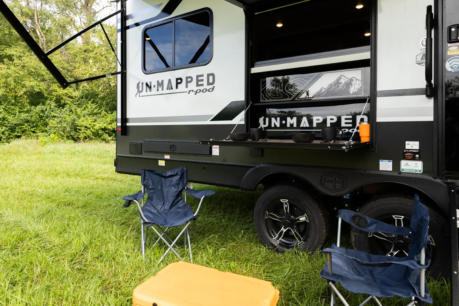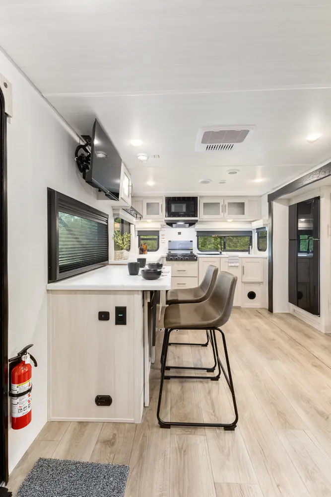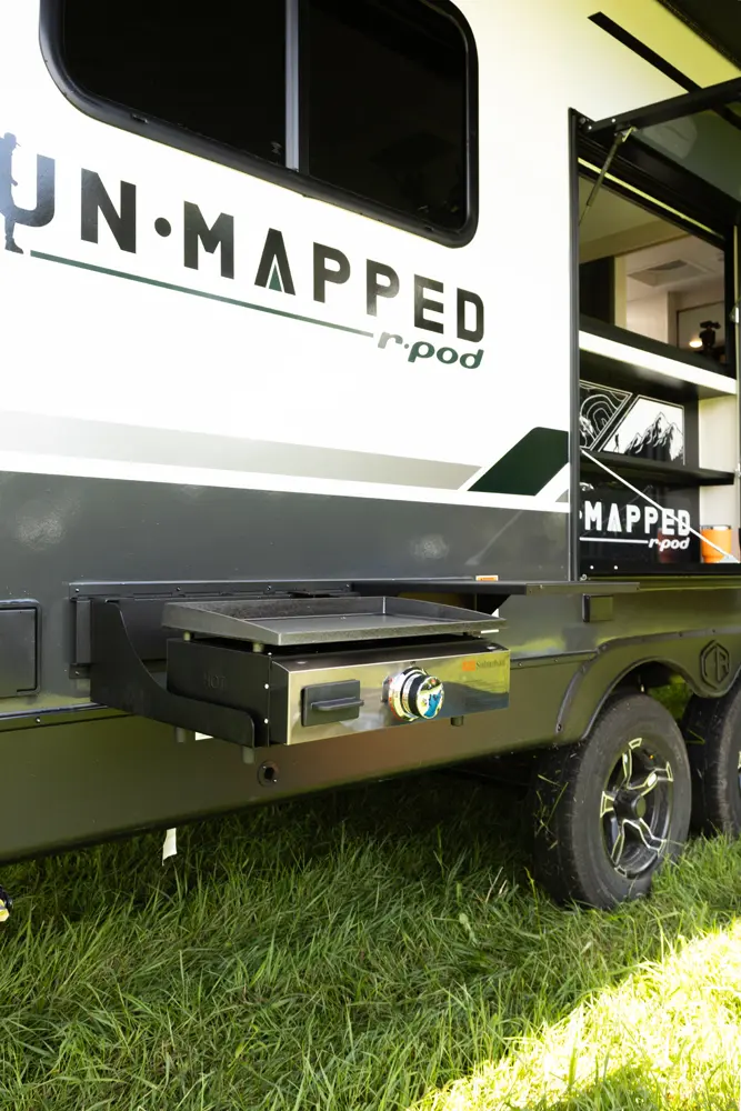 The Un•Mapped 24RK features a rear kitchen layout with a 12V black glass refrigerator, and an air fryer microwave. The Bar2Table pull-out dinette and TrailGate outdoor bar enhance dining flexibility and outdoor entertaining. Inside, enjoy a king bed, 15K A/C, and a tankless on-demand water heater. Exterior amenities include a 21' powered awning and a hot & cold spray port.