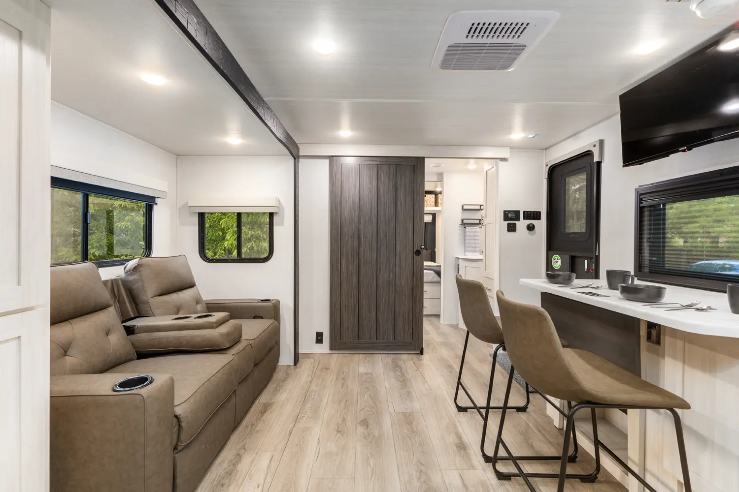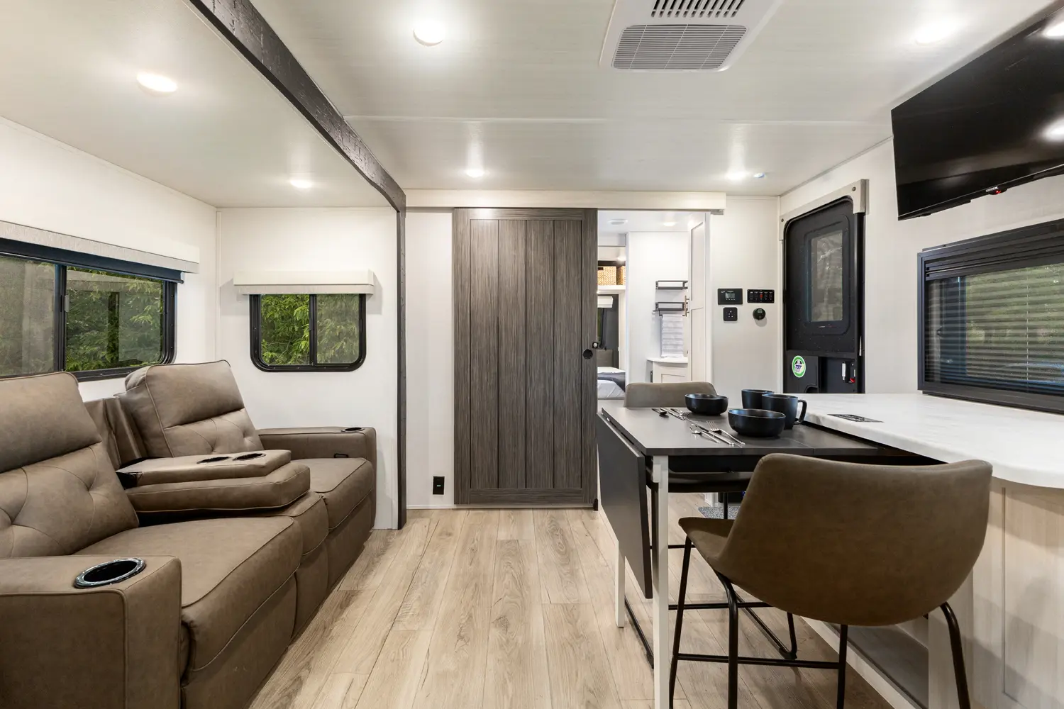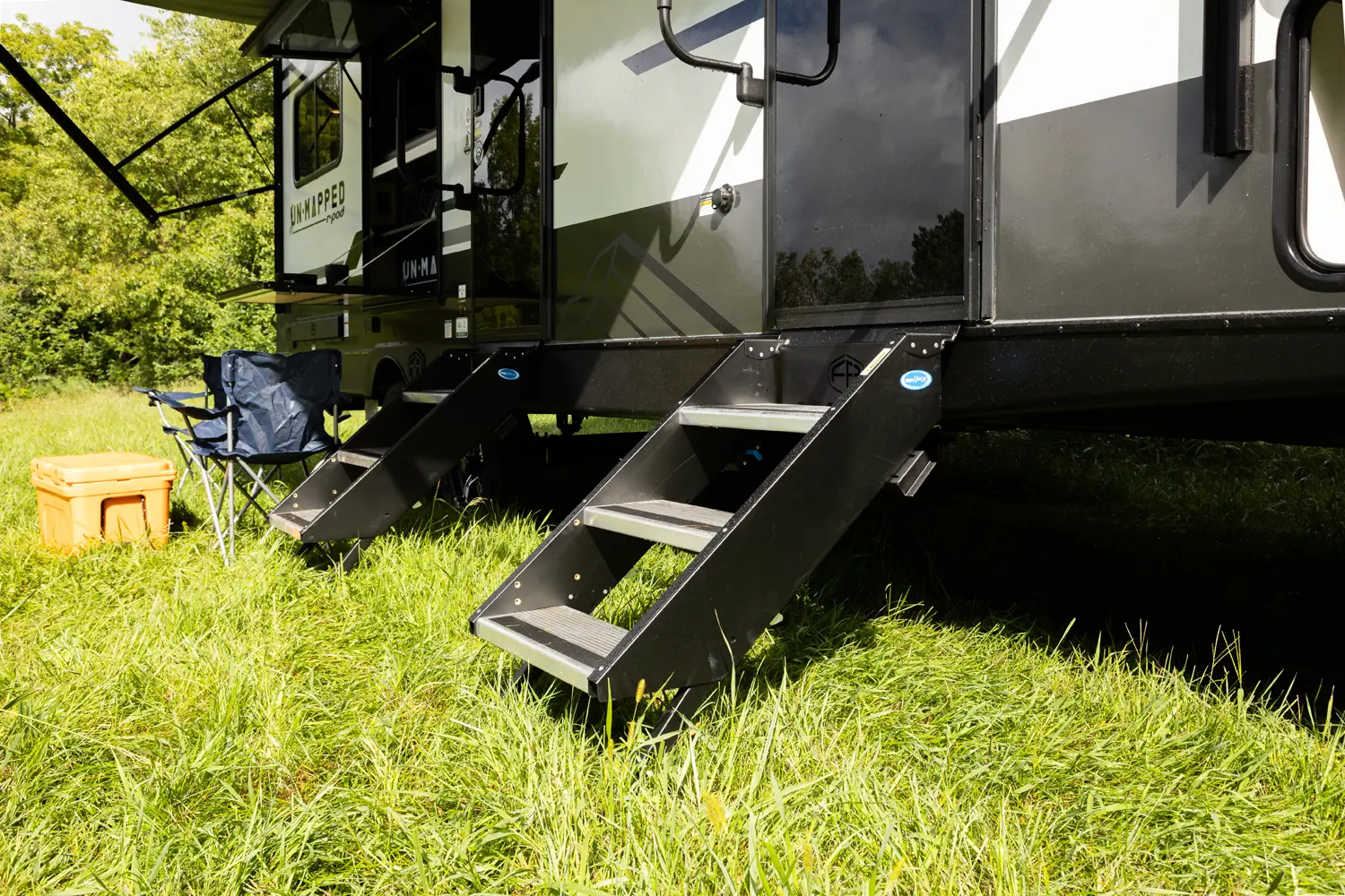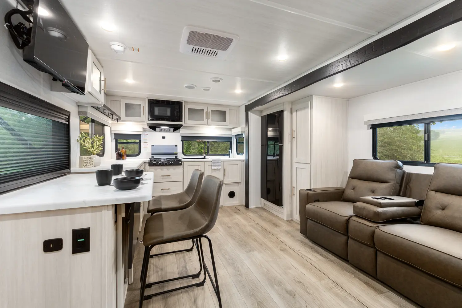The Un•Mapped 24RK features a rear kitchen layout with a 12V black glass refrigerator, and an air fryer microwave. The Bar2Table pull-out dinette and TrailGate outdoor bar enhance dining flexibility and outdoor entertaining. Inside, enjoy a king bed, 15K A/C, and a tankless on-demand water heater. Exterior amenities include a 21' powered awning and a hot & cold spray port.