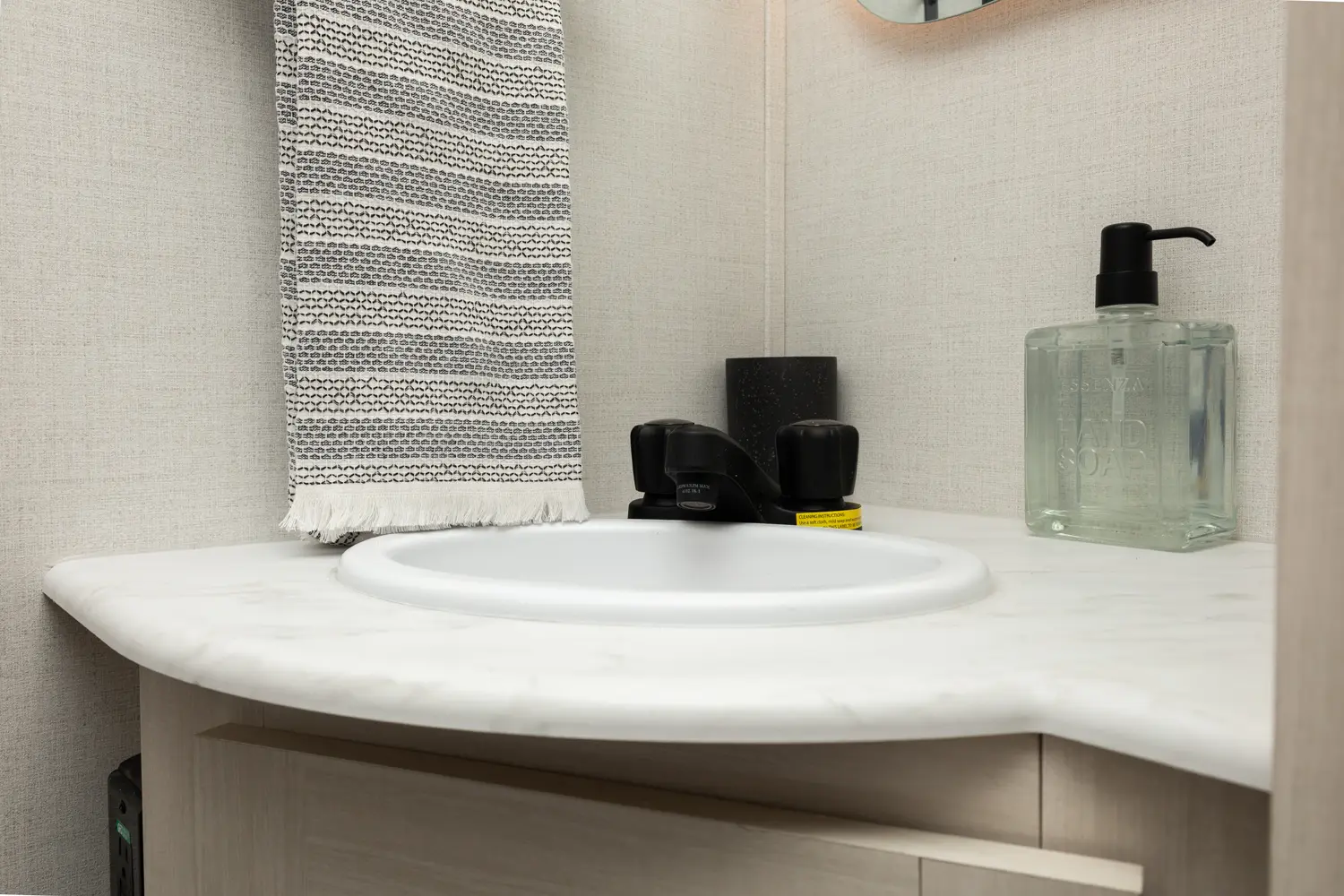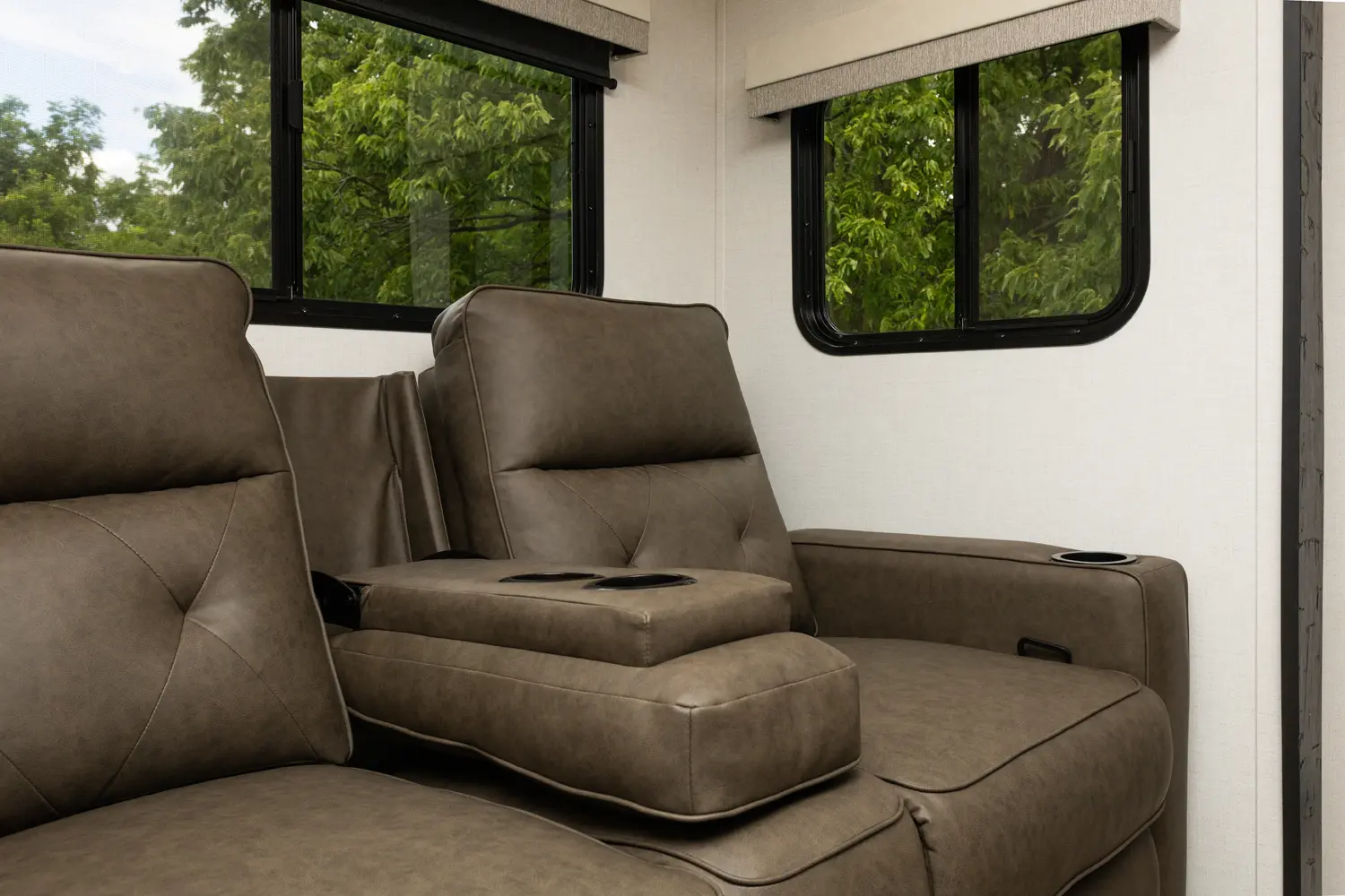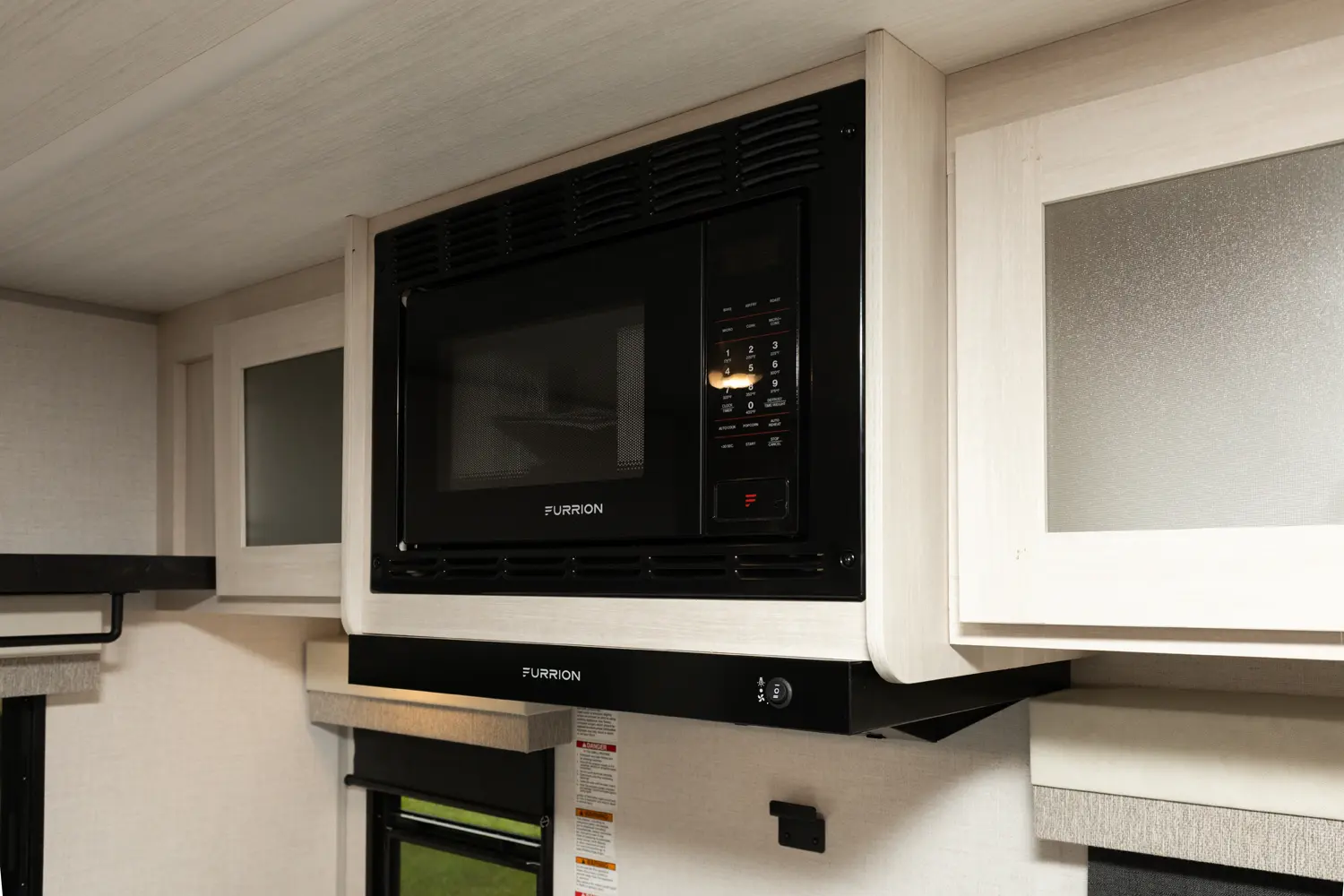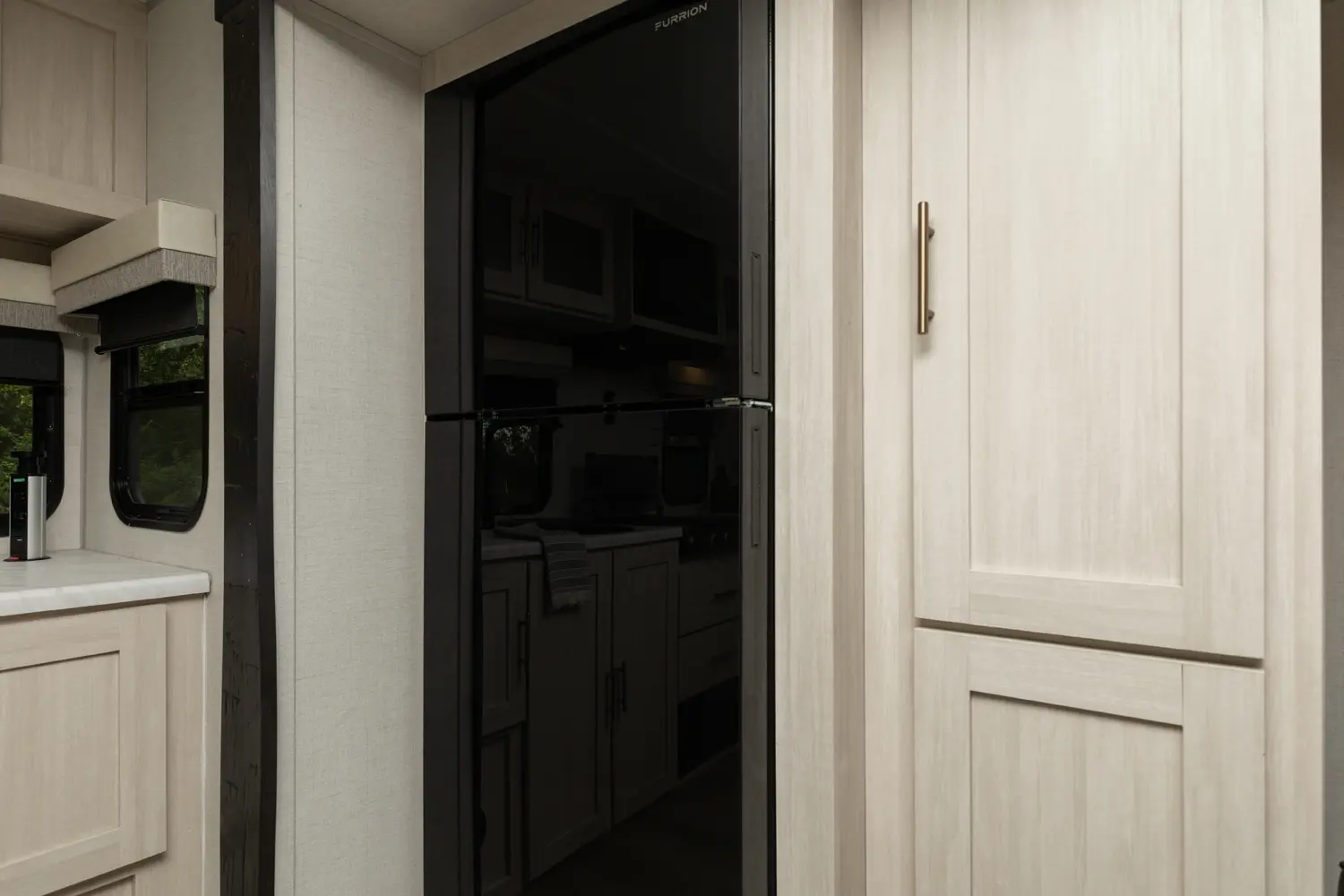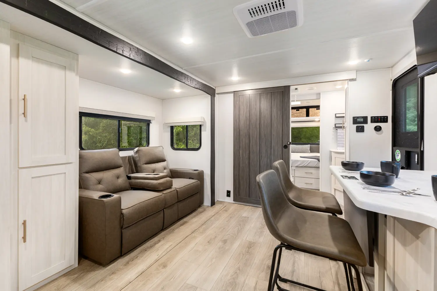 The Un•Mapped 24RK features a rear kitchen layout with a 12V black glass refrigerator, and an air fryer microwave. The Bar2Table pull-out dinette and TrailGate outdoor bar enhance dining flexibility and outdoor entertaining. Inside, enjoy a king bed, 15K A/C, and a tankless on-demand water heater. Exterior amenities include a 21' powered awning and a hot & cold spray port.