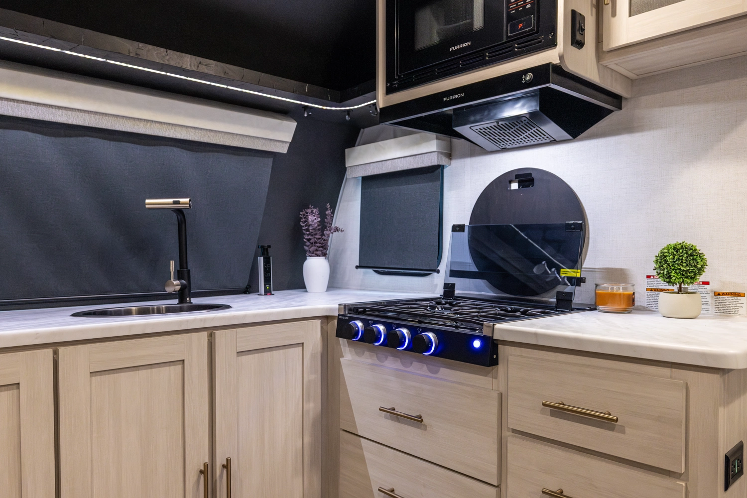The Un•Mapped 25FK features a front kitchen with a 12V black glass refrigerator and an air fryer microwave. The Bar2Table pull-out dinette and TrailGate outdoor bar enhance dining flexibility and outdoor entertaining. Inside, enjoy a king bed, 15K A/C, and a tankless on-demand water heater. Exterior amenities include a 21' powered awning and a hot & cold spray port.