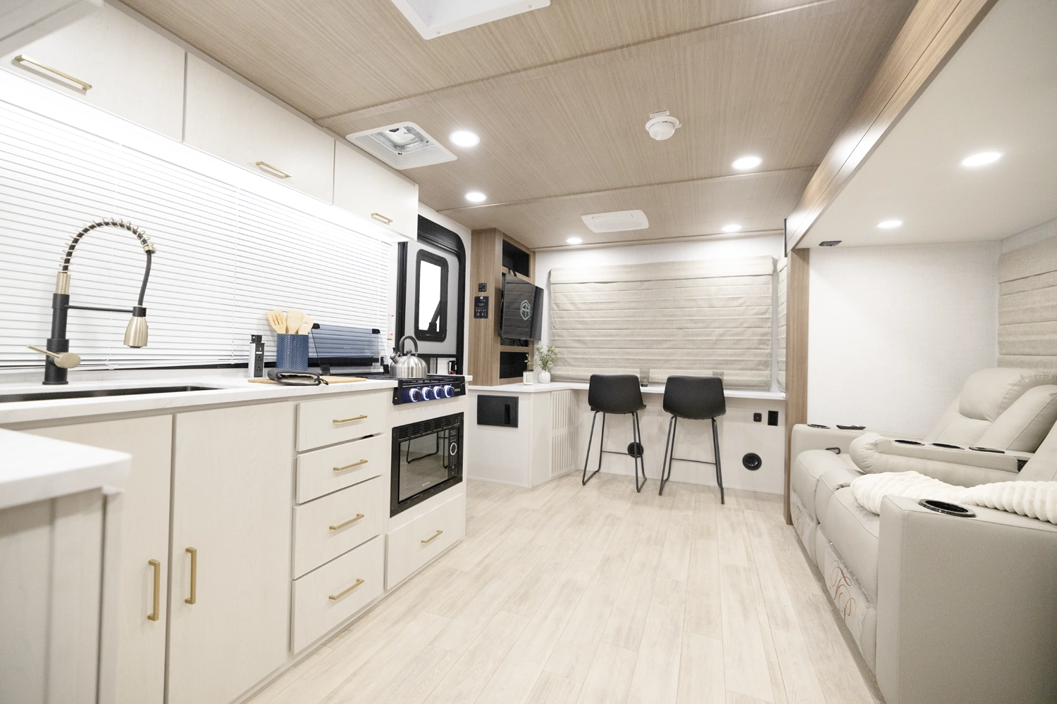 The 2400RB is great for couples who enjoy scenic views from the comfort of their living space. With almost a full panoramic view in part to our European-Style square windows, there is no shortage of natural light with a spacious open feel. The 2400RB comes packed with already added features such as 2 A/Cs, a king bed, porcelain toilet and much more!
