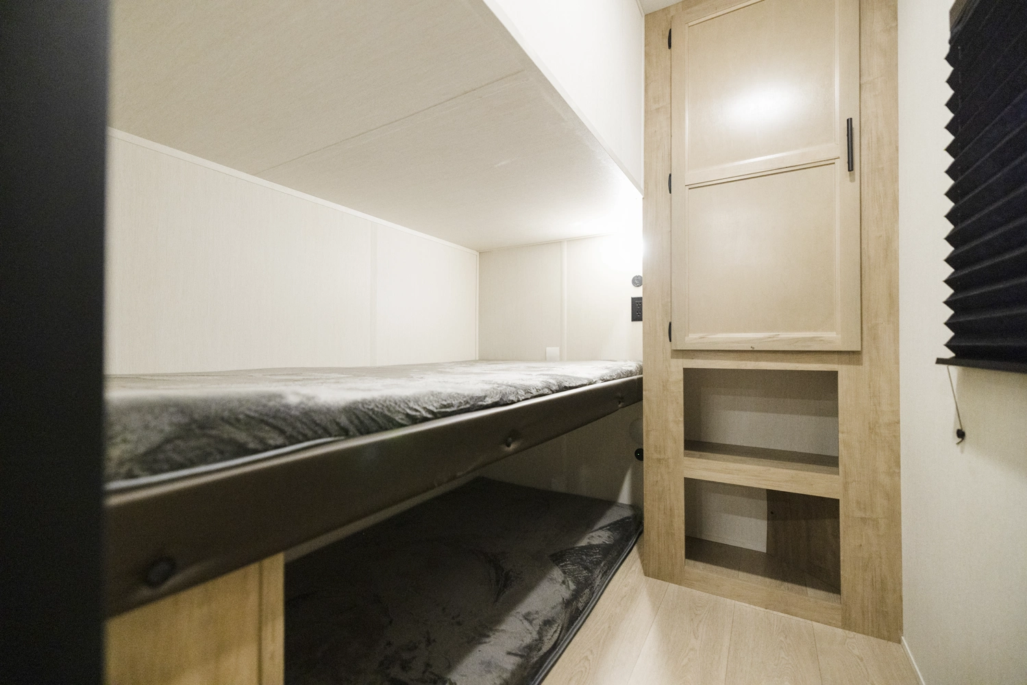 This innovative model lets the customer escape the ordinary with this 3 bedroom model. What separates the 294GEBG from the rest is the rear sleeping areas where a full queen loft bed is featured along with a private bunk area off to the side. This separation created privacy and allows for a Full Bar and Grill featuring an exclusive side-by-side refrigerator and freezer, ice maker, pull-out cooktop, sink and large storage areas.