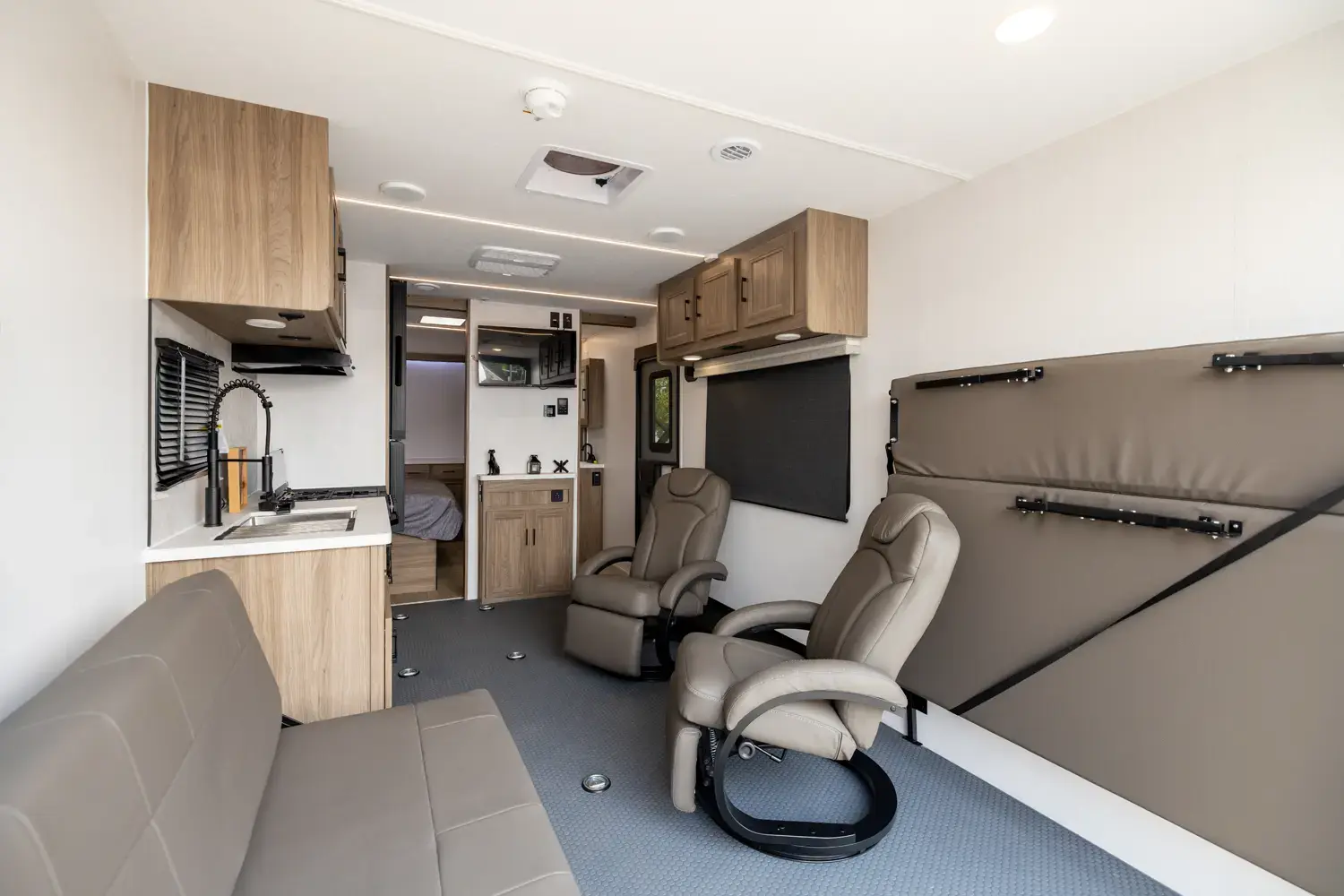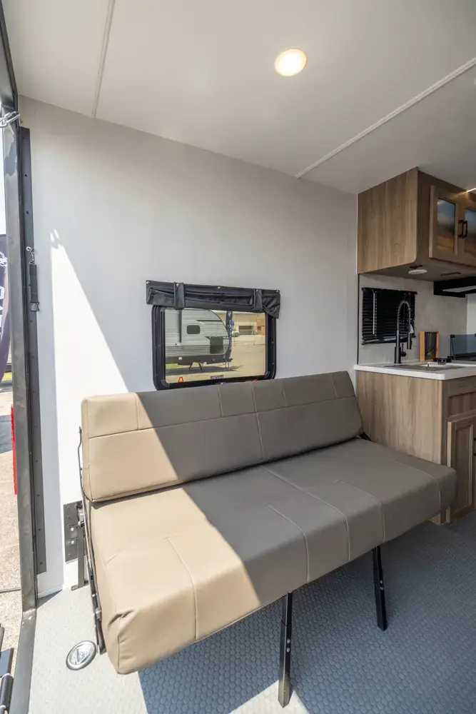 At 27' 5", the Work & Play 21LT expands garage room while still staying tow-friendly for outdoor enthusiasts. The large cargo bay handles your gear, and the interior supports both gear storage and comfortable breaks. Ideal for off-road adventures or family trailside escapes.