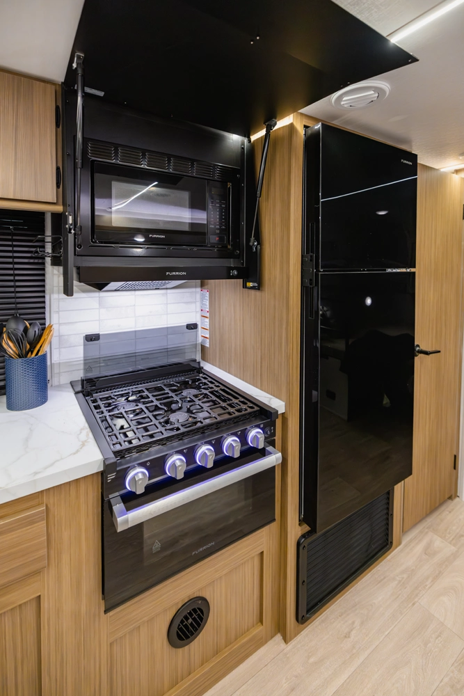 The 263BHXL is perfect for family travels. The rear features two oversized bunks for the kids, with plenty of space to stretch out. The grown-ups will sleep soundly in the front queen bedroom, which includes hanging closets and under-bed Stow N Go Storage. The living area includes panoramic windows and the Versa-Lounge. The kitchen provides a 11 CU. FT. refrigerator and TONS of storage.